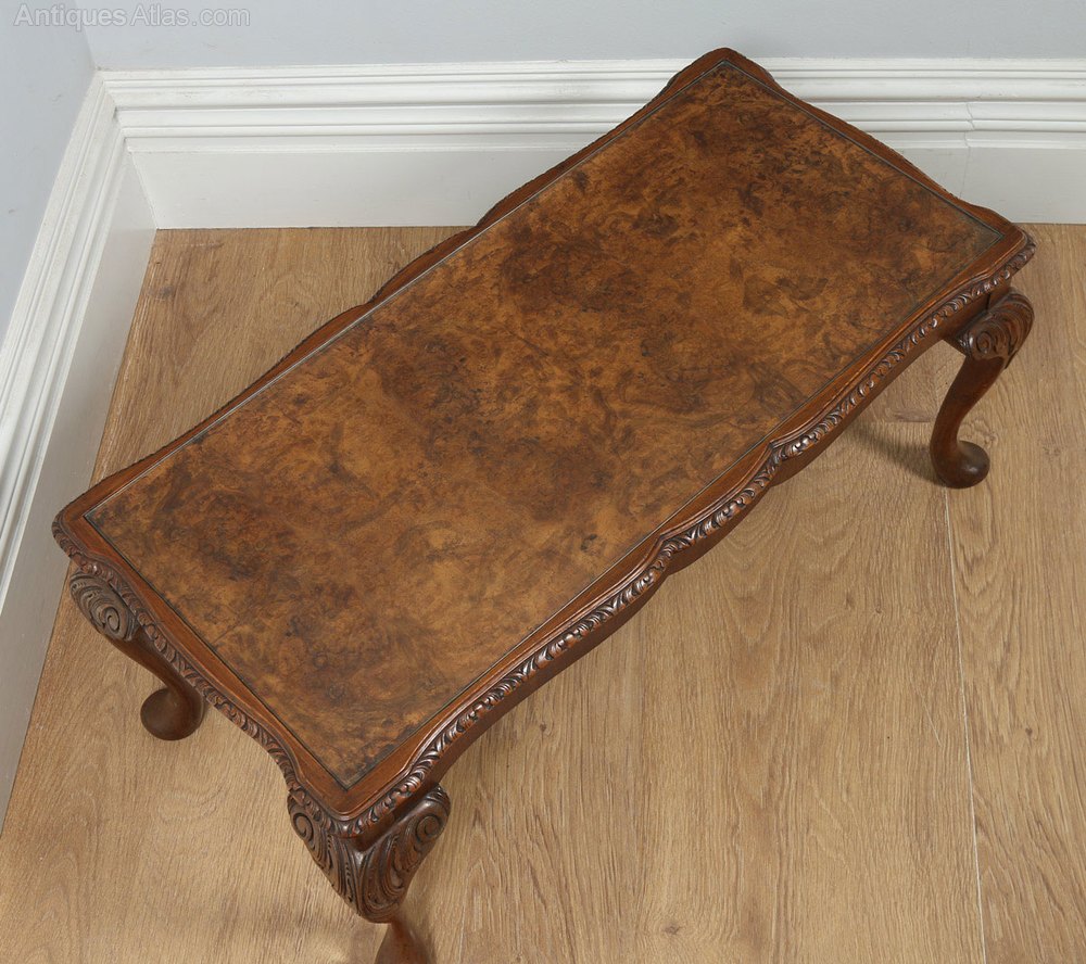 Here is a fine quality antique Queen Anne style carved burr walnut rectangular coffee table with a glass top, circa 1920, in good original condition.
