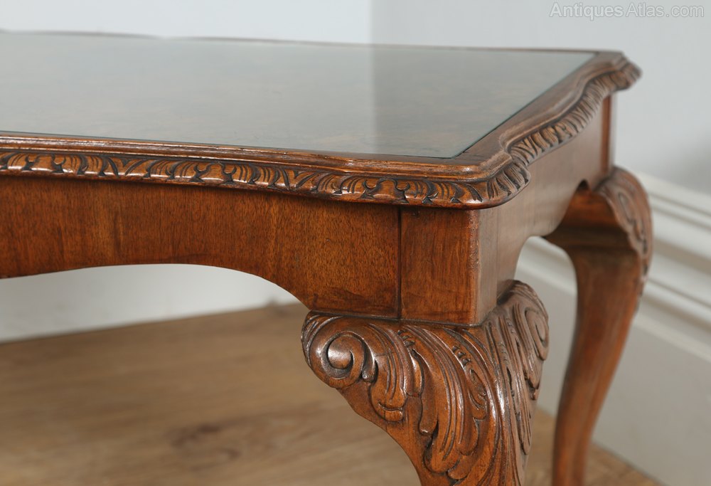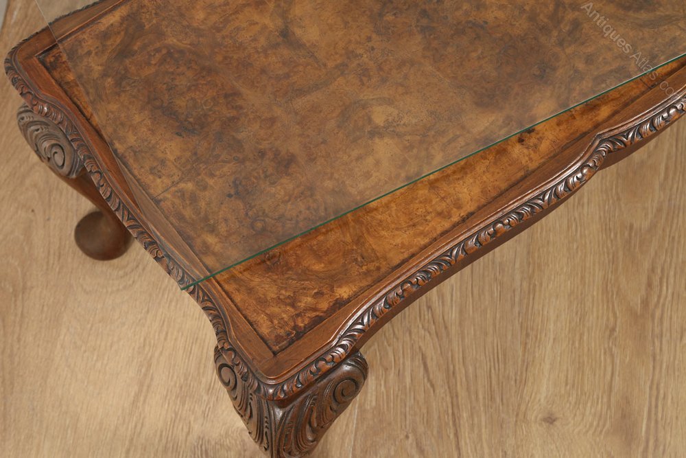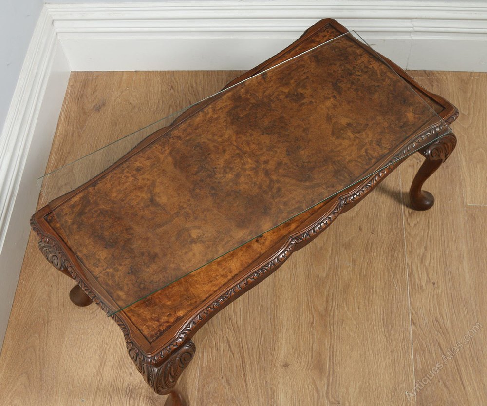 Condition This coffee table is in good original condition. Nominal old use marks to the leading edges but nothing significant considering the age of the item. There is a lovely mellow colour and patination to the burr walnut top and frame. As the table boasts the original polish, it has a fantastic colour and patination this can only be achieved through age and years of care and cleaning it has received. The table is constructed of solid walnut frame with a burr walnut veneer top. The floral carving to the moulding is intact. The removable shaped glass top is also in good condition and is free of any damage, scratches or chips. This item is solid in joint (does not wobble) and ready to use.
