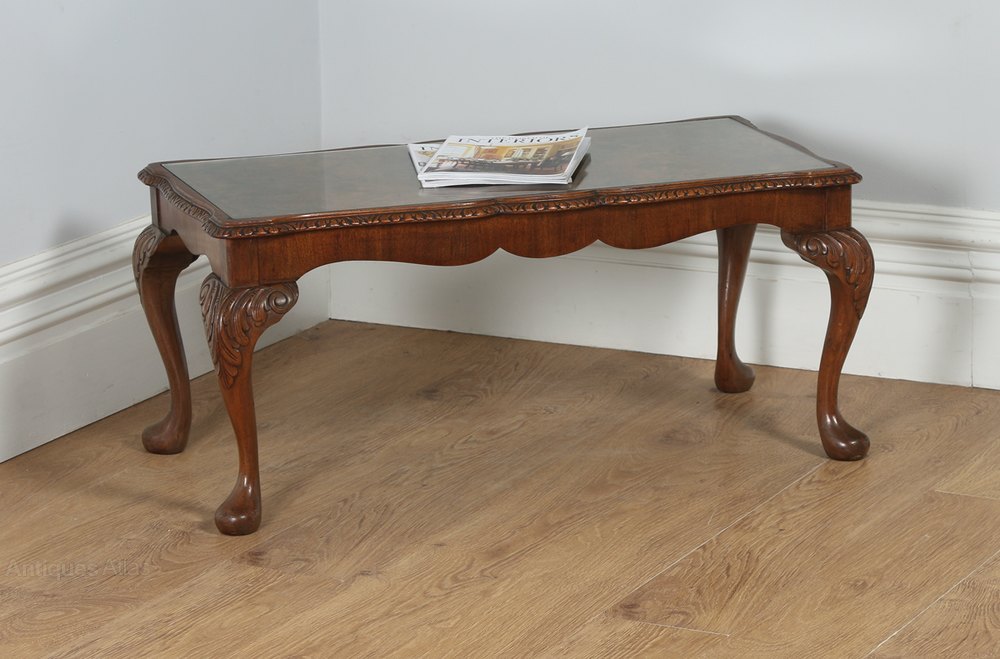 This coffee table is in good original condition. Nominal old use marks to the leading edges but nothing significant considering the age of the item. There is a lovely mellow colour and patination to the burr walnut top and frame. As the table boasts the original polish, it has a fantastic colour and patination this can only be achieved through age and years of care and cleaning it has received. The table is constructed of solid walnut frame with a burr walnut veneer top. The floral carving to the moulding is intact. The removable shaped glass top is also in good condition and is free of any damage, scratches or chips. This item is solid in joint (does not wobble) and ready to use.