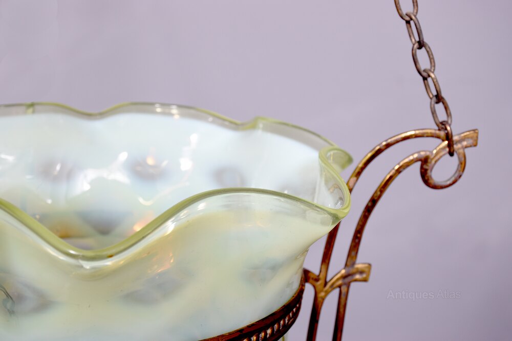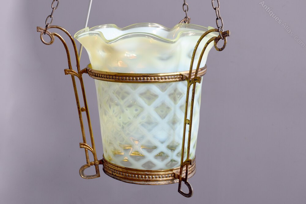 Circa 1890. Rare Art Nouveau Vaseline Glass and Brass Circular Light Fitting. The shaped and coloured Vaseline glass with a crenated top supported in an Art Nouveau style brass frame and suspended on three brass chains. In perfect condition.