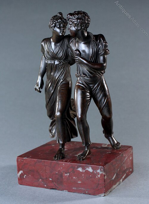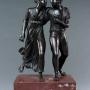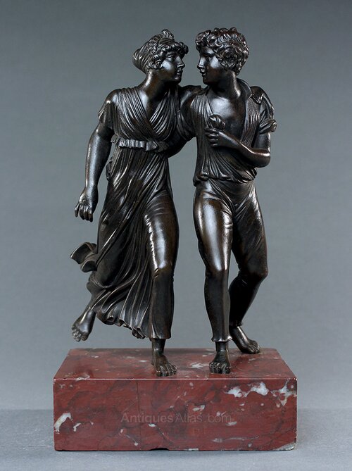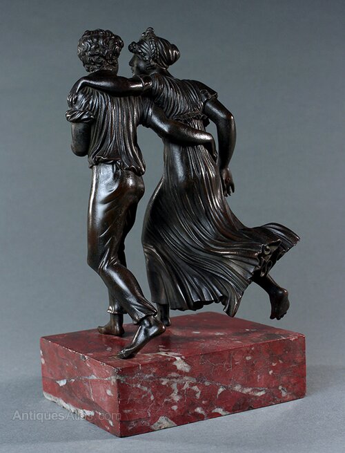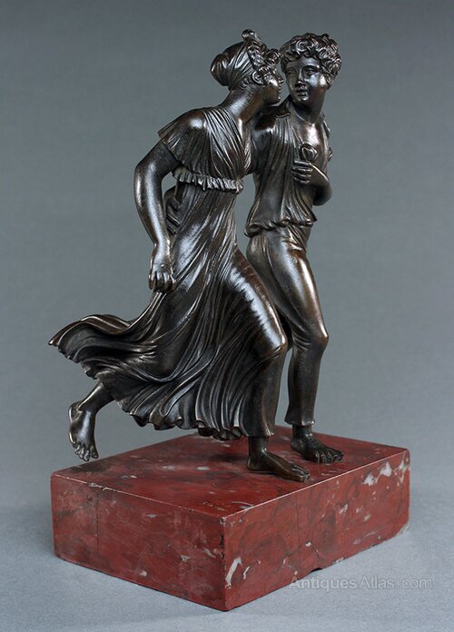 Important late 18th / early 19th century French Directoire bronze statue based on the popular romantic novel set in Mauritius, 'Paul et Virginie' by Jacques-Henri Bernardin de Saint-Pierre, published in 1788. The novel, inspired by the writings of Jean-Jacques Rousseau was hugely popular in Revolutionary France. This pair of figures are identical to ones found on important Directoire period 'Au Bon Sauvage' clocks of the same subject matter. Please contact us as we have one in stock. Dark patinated bronze on a sustantial Rouge Giotte Marbre block base. France, circa 1800.