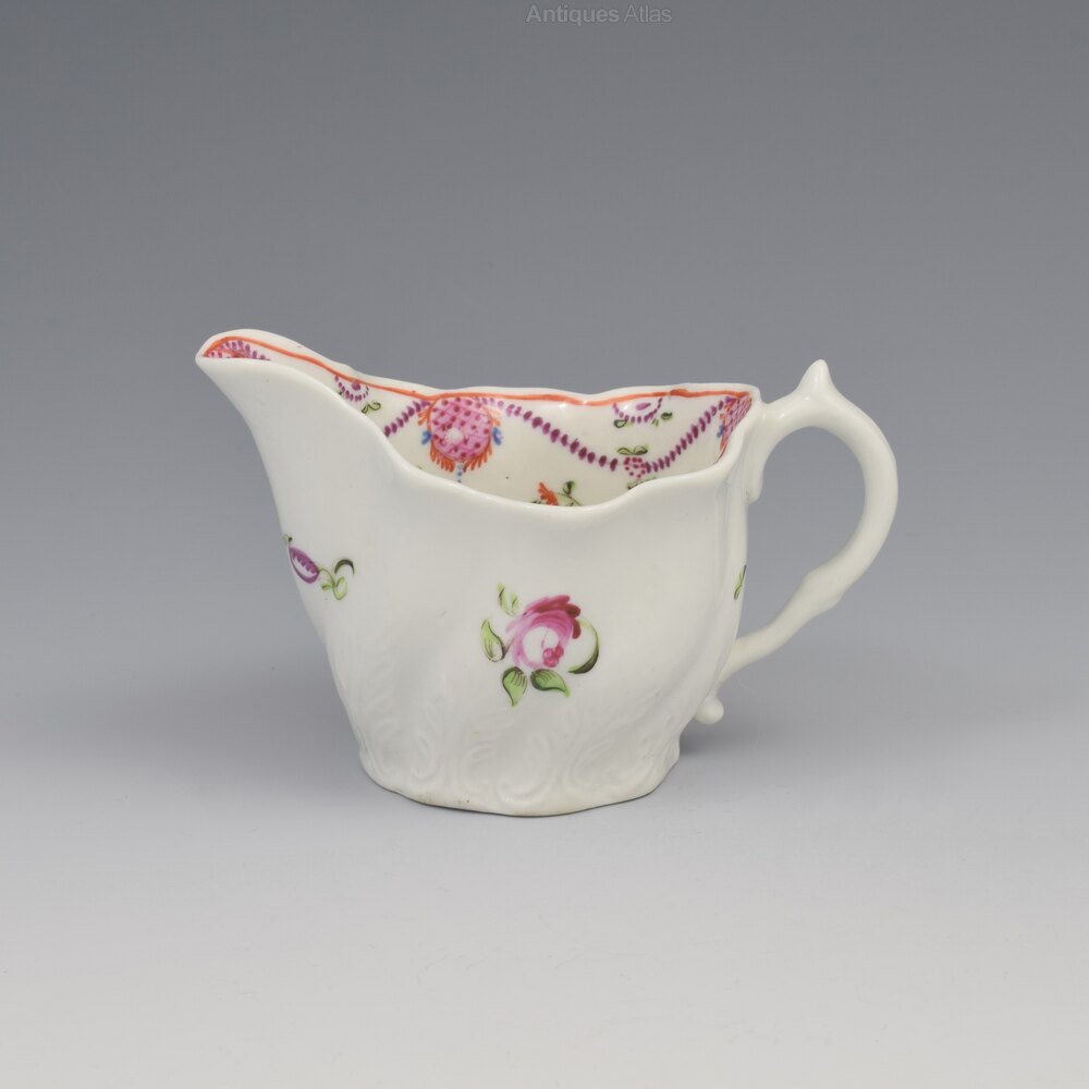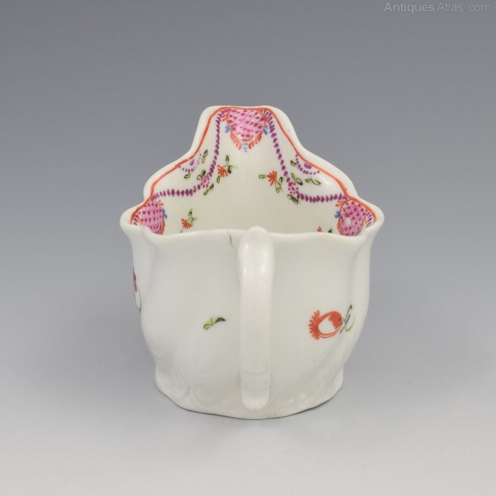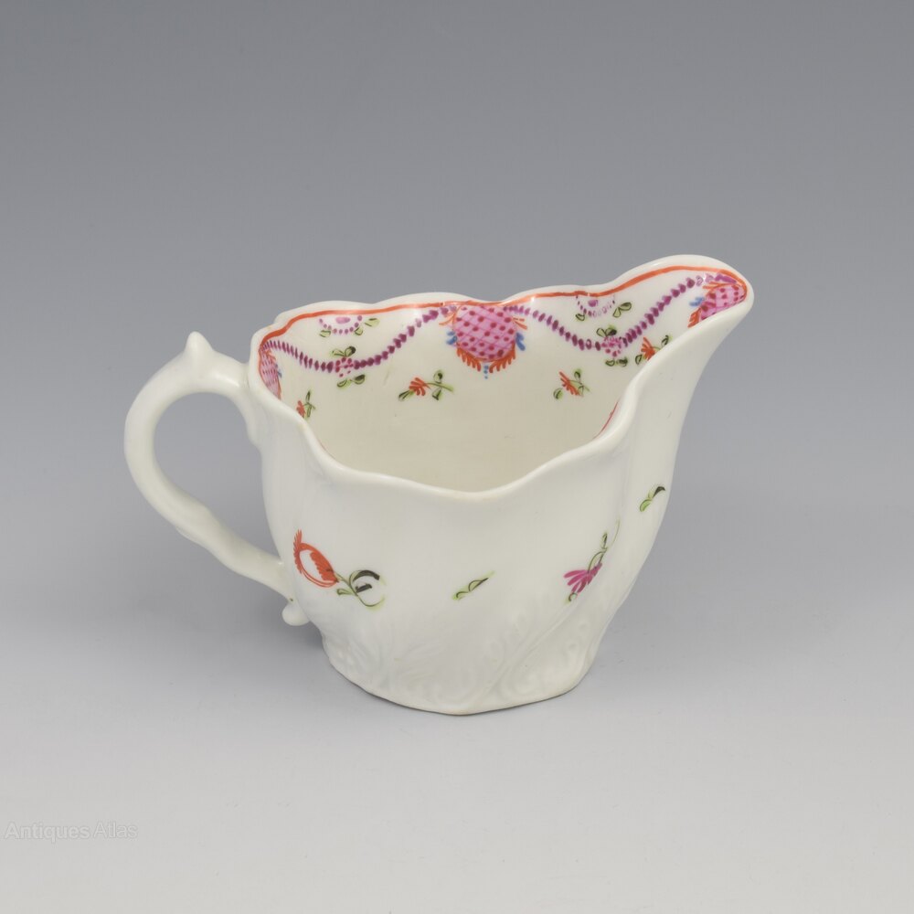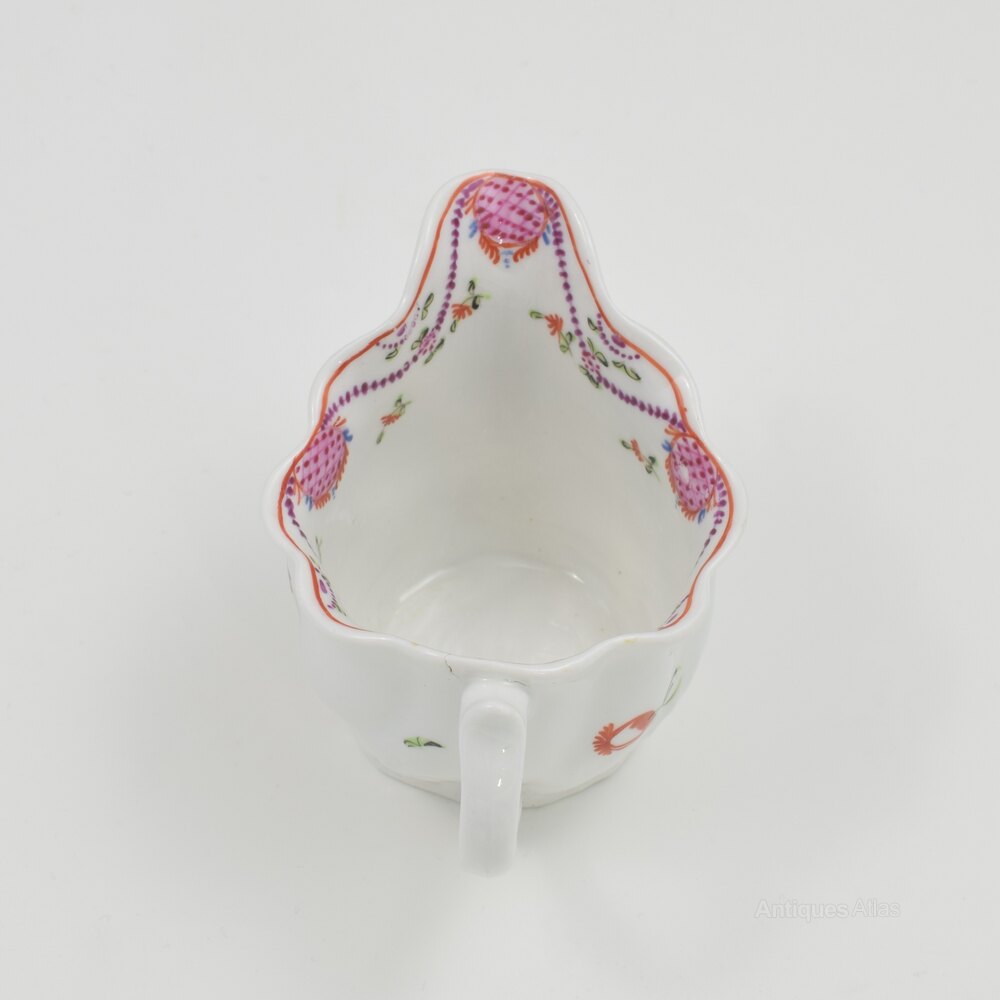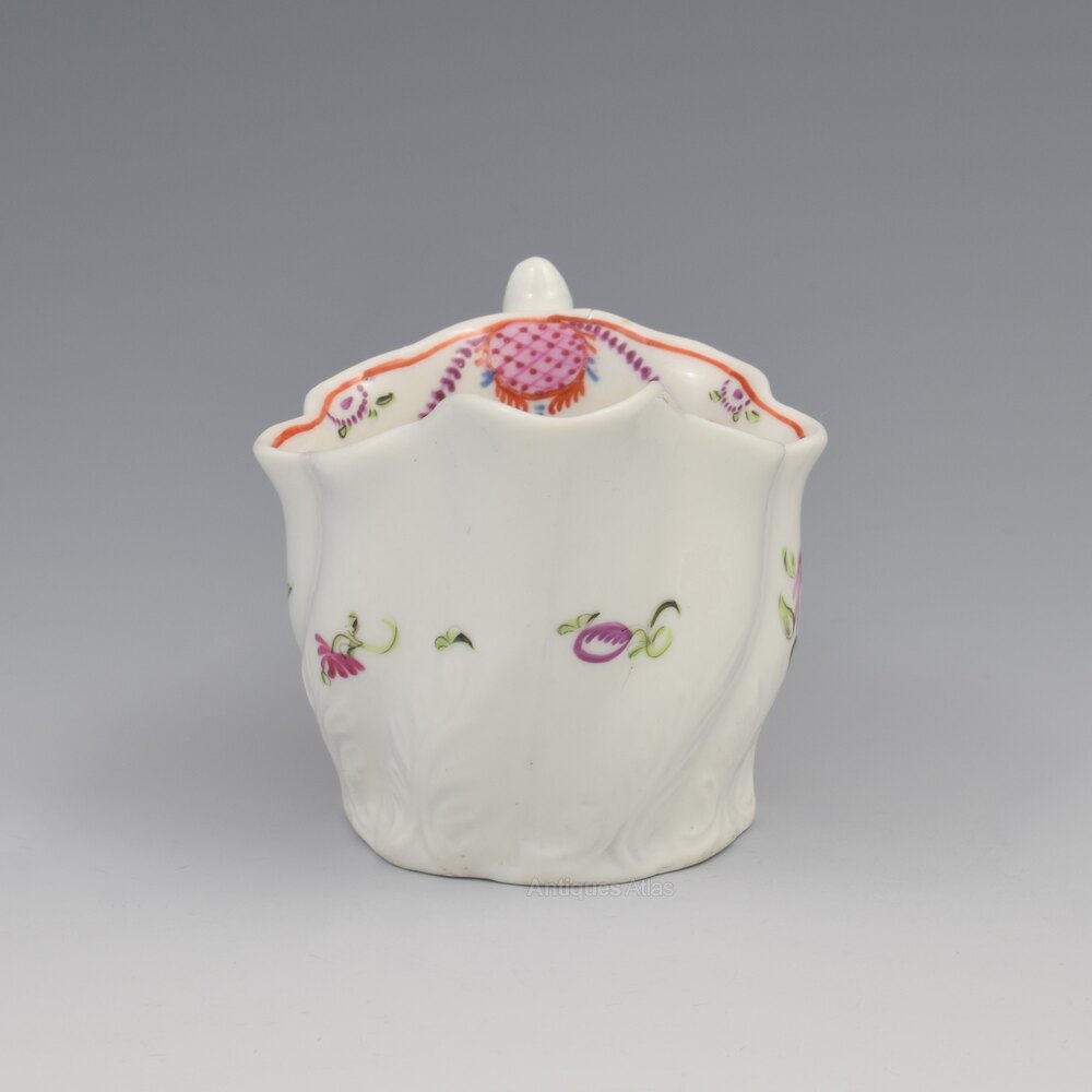 An attractive and rare "Chelsea ewer" shape low porcelain cream jug, made in the very early days of John Rose at Caughley or the new Coalport site. The body, in a hard paste, well modelled with spiral fluting and detailed acanthus leaf moulding, raised shaped rim and distinctive shaped handle. Decorated in the New Hall style in bright pastel enamels. Unmarked, c.1796.