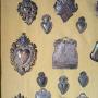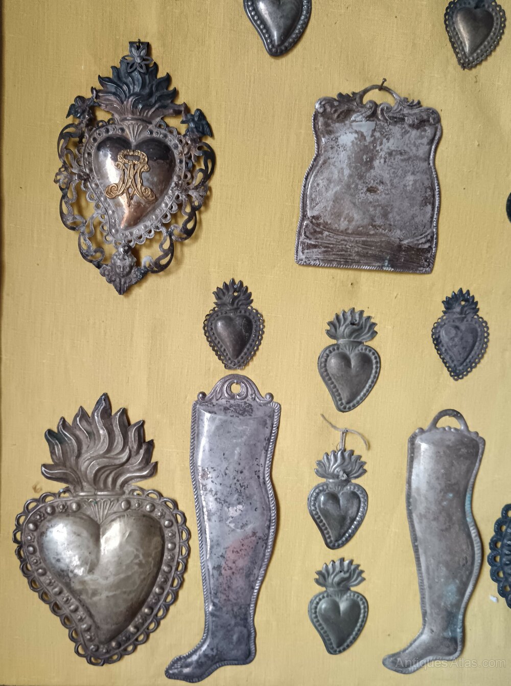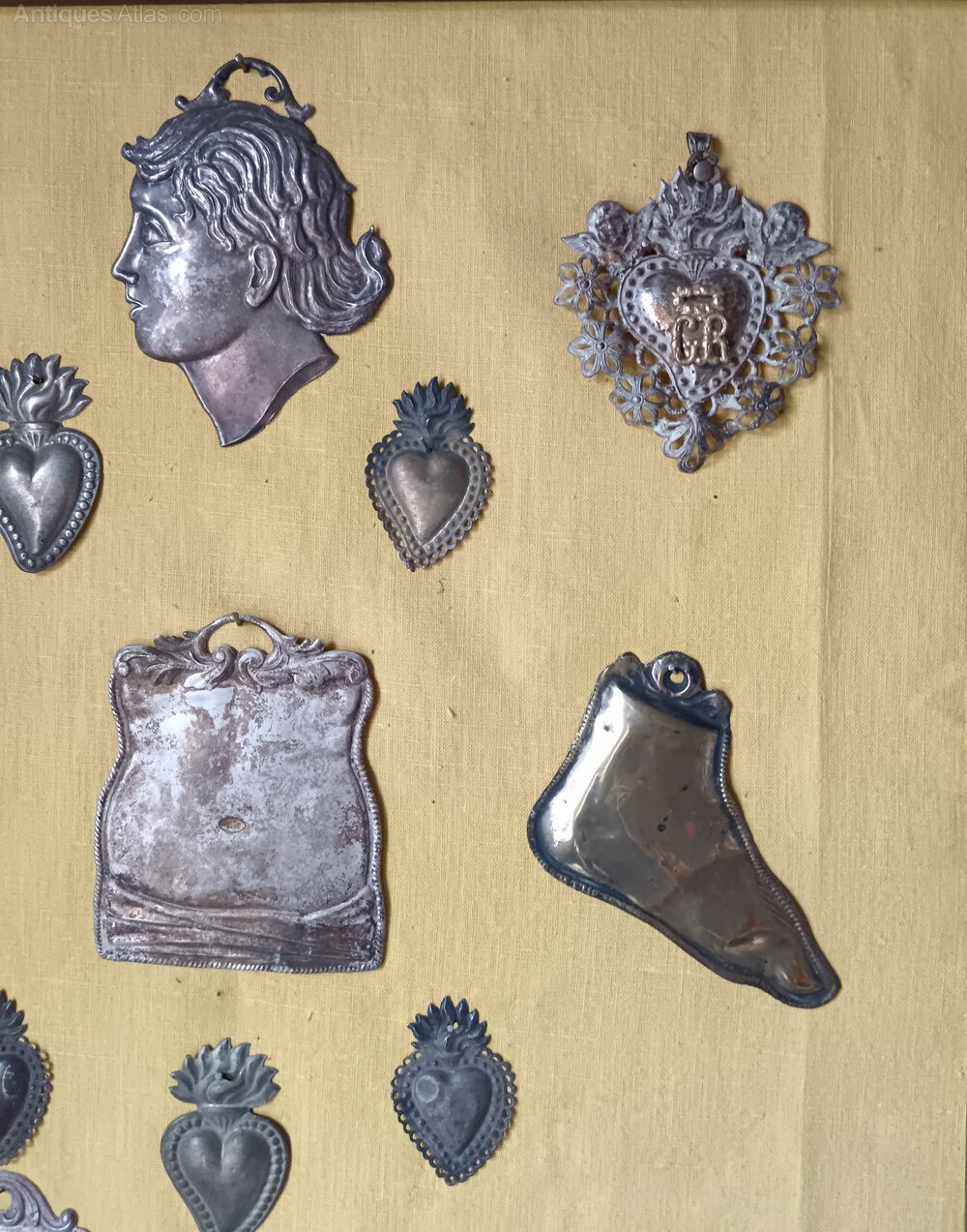 This is a framed collection comprising seventeen antique Italian ex-votos. The assemblage features ex-votos in the shapes of a head, foot, torso, legs and several hearts of varying sizes and forms. These items are presented within an elegant, plain ebonised frame—potentially predating the ex-votos themselves—which showcases a yellow fabric background that provides a refined setting. Traditionally, such ex-votos serve as objects of thanksgiving offered upon fulfillment of a wish, making this collection both distinctive and highly collectible.