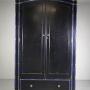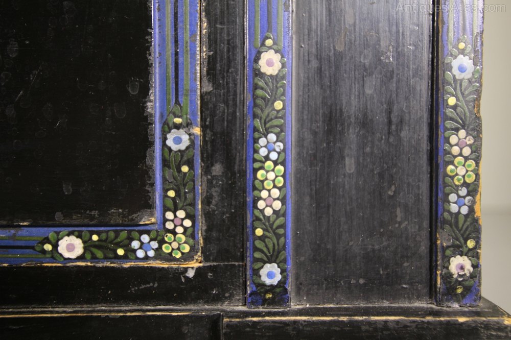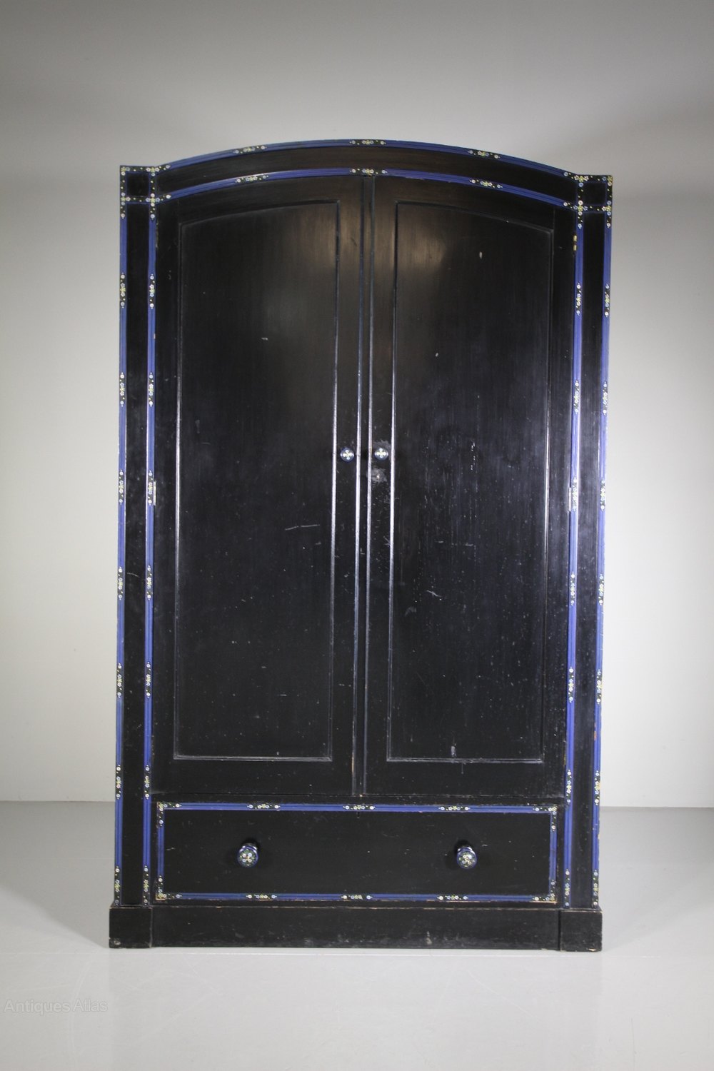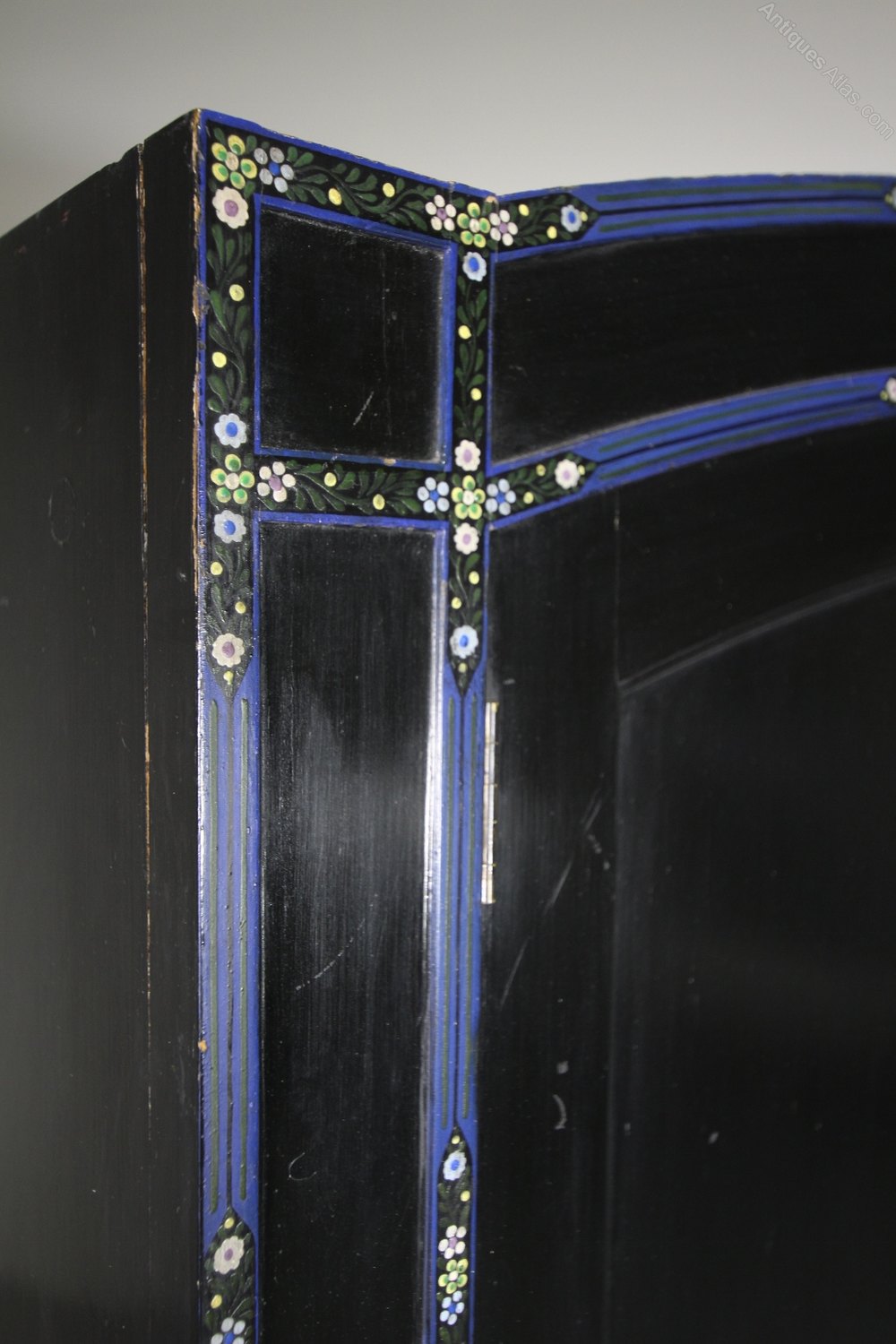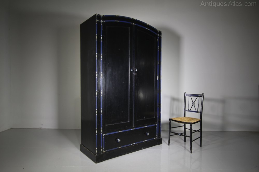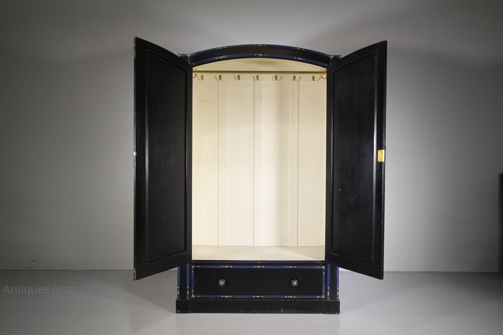 A superb quality Heals of London antique original painted pine wardrobe, a very rare model in the original ebonised black paint finish and with lovely original blue line decorations and hand painted floral motifs by Miss Hindshaw who was art teacher at the L.C.C. Central School of Arts & Crafts. Even with the original cream painted interior along with a brass hanging rail and brass hanging hooks. This rare Heals antique slightly arched top wardrobe has two long robe doors over a single drawer, complete with all the original handles and with a working lock and key. In excellent, original condition throughout, made in solid Paine and the wardrobe can lift off the plinth. A very rare model, we have the matching dressing table, and clothes rail.