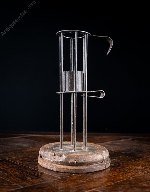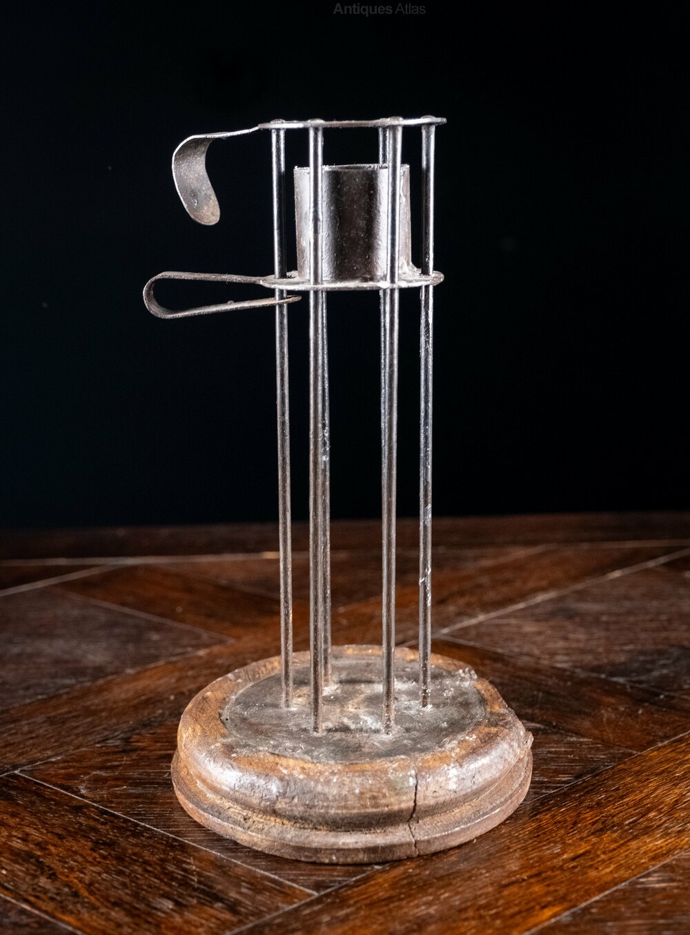 The adjustable candle holder sits within a frame with a shaped carrying handle to the top and above a turned wooden base. The candle holder is in a good honest untouched condition, still with remnants of wax throughout the interior and speckled to the base.