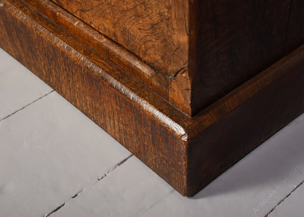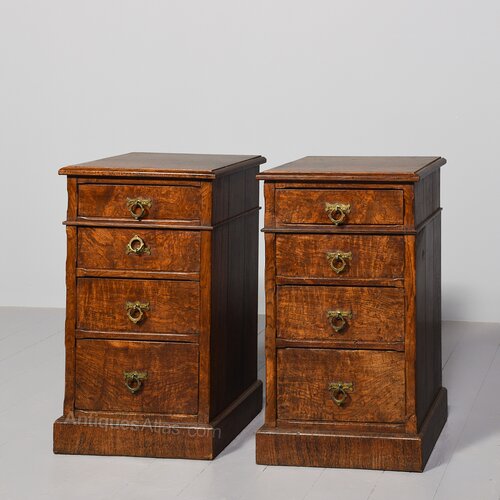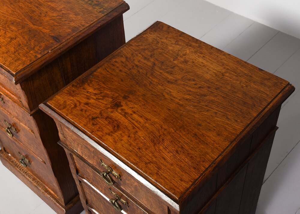 The tops in an unusual figured pollard oak with moulded edges above four graduated drawers with Art and Crafts brass handles and mahogany drawer linings (sign of quality). The corners with Arts & Crafts chamfering, and sitting on enclosed plinth bases.
