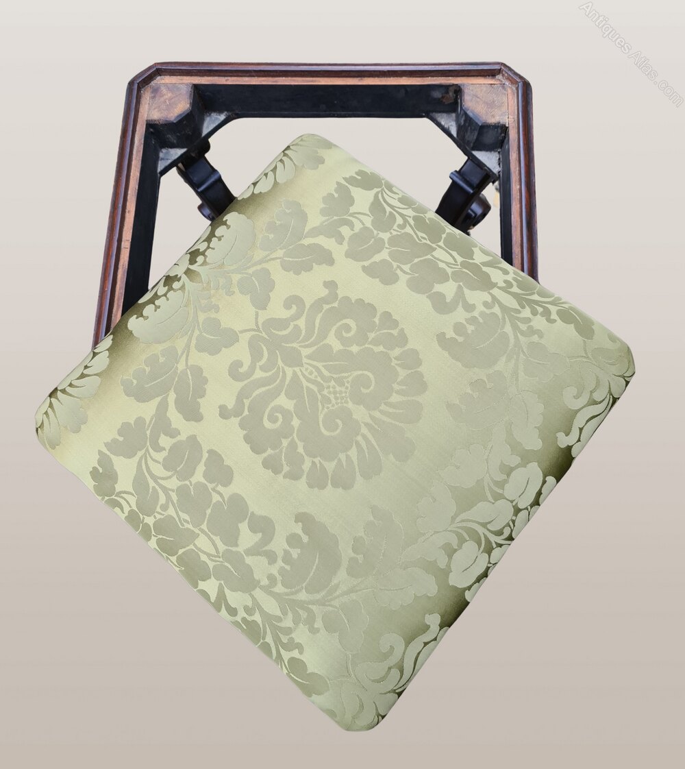 A rare example of a stool upholstered in French brocade. Wonderful patina and rich colour in the Chippendale taste. Stylish blind fret frieze around the stool with intricately carved and shaped legs and feet and bobbin turned cross stretchers with finial to the centre. It stands on original small brass castors which are virtually hidden from view.