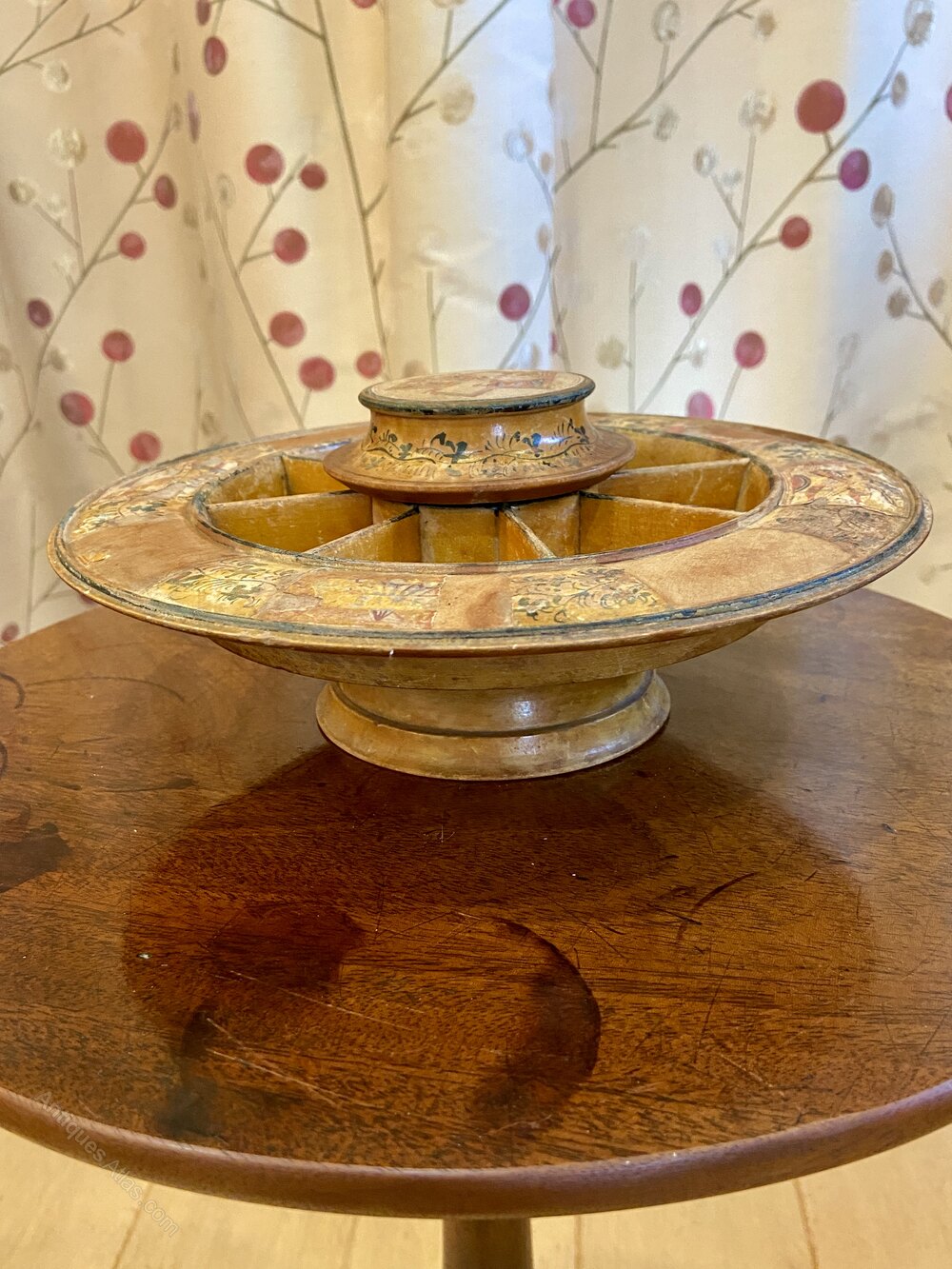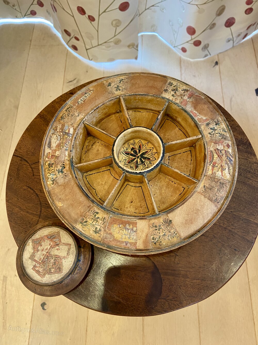 Rare Regency Tunbridgeware white wood games wheel used to play “Matrimony and Pope Joan” Age related wear as shown in photos but with a good amount of original paint and prints. 26cm diameter. Really interesting historic piece.