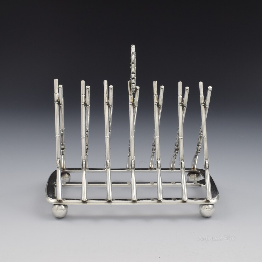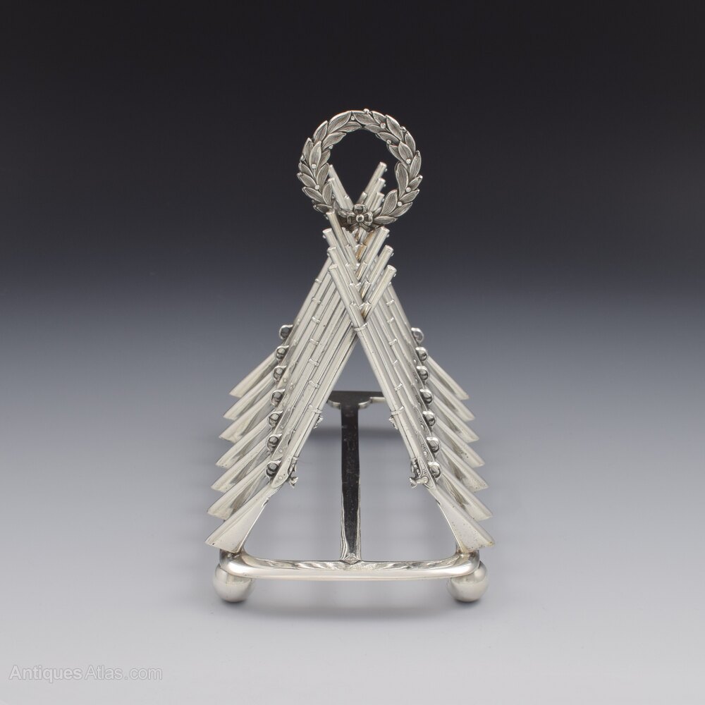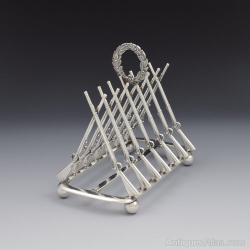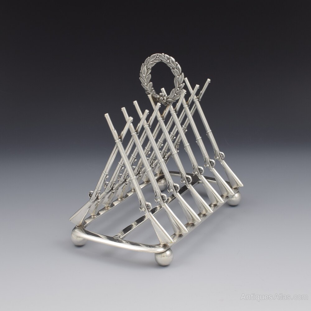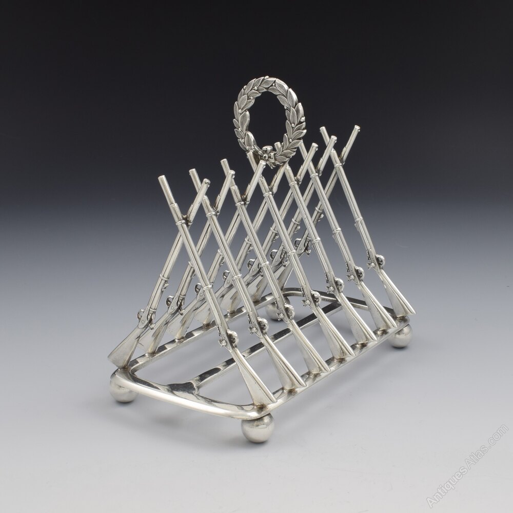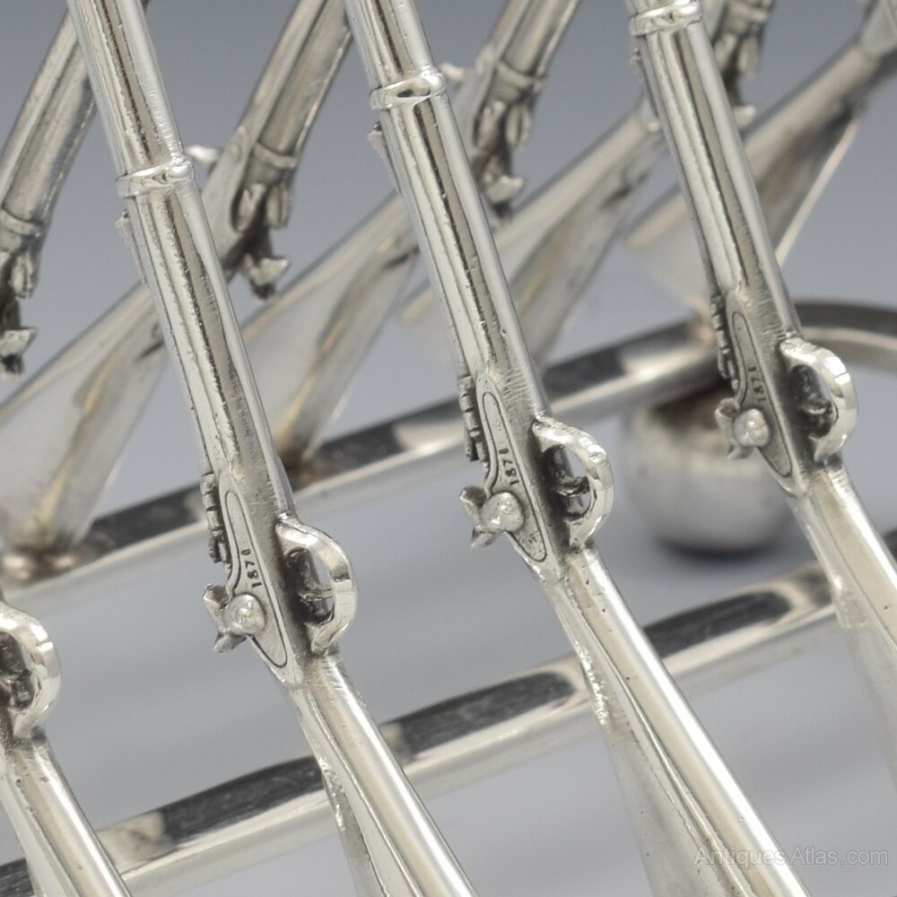 An unusual, superb quality Victorian silver plated six slice toast rack formed from crossed rifles, very finely cast and each stamped also with the number 1871 just above the trigger. The handle is formed as a wreath. Stamped with a registration design lozenge dating the piece to October 1871 and the maker's mark for Thomas Campion & Sons of Sheffield. It is thought to been made in commemoration of the end of the Franco-Prussian (German) war.