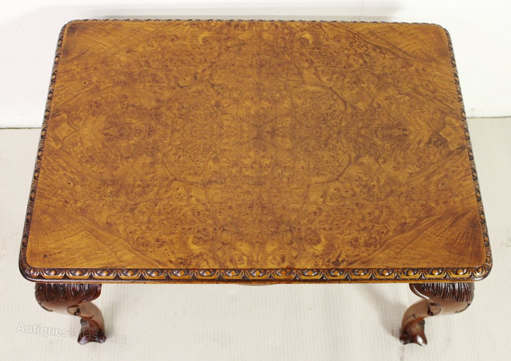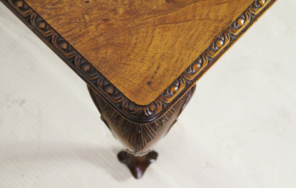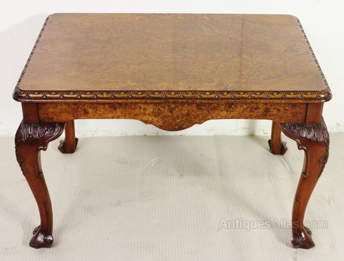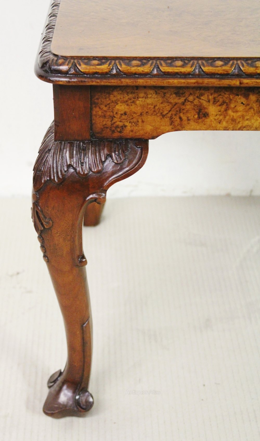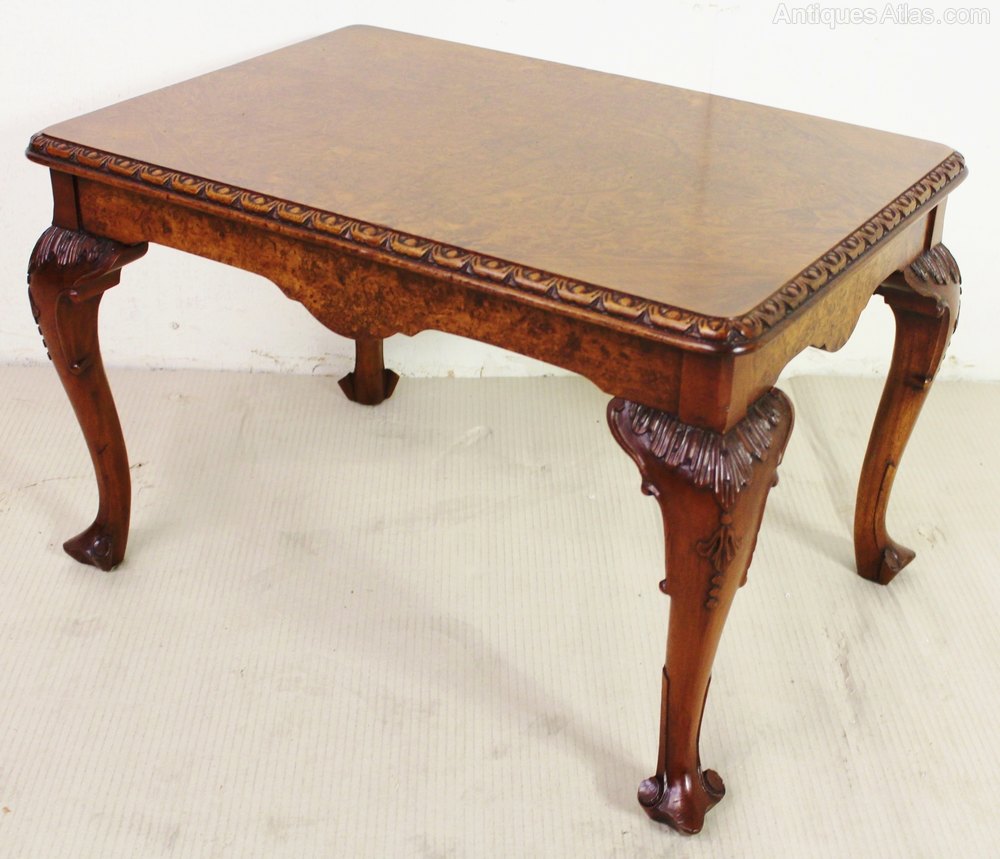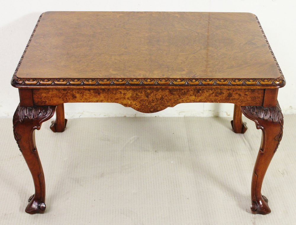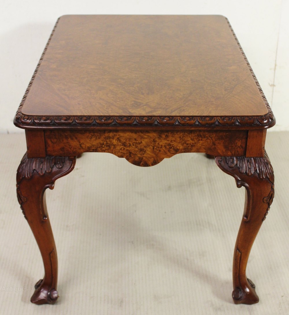 A very good rectangular burr walnut coffee table in the Queen Anne style. Well made in solid walnut with attractive burr walnut veneers. The rectangular has a crisp gadrooned edge and teh freeze beneath is also in burr walnut. The table stands well on cabriole legs with crisply carved detailing to the knees and terminating in stylised feet. We have had this lovely table professionally repolished to a very high standard. It is now offered for sale in excellent condition with a wonderful colour, ready to go straight into the home.