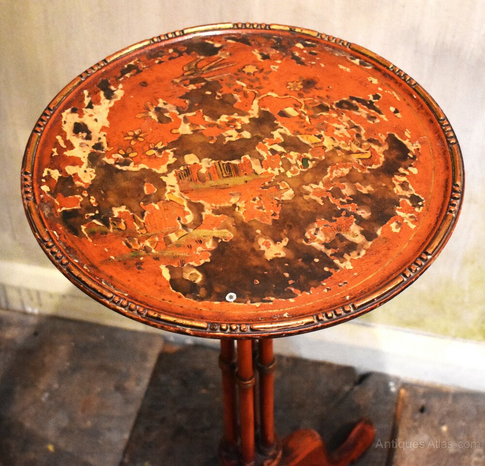A very decorative red lacquer wine table. The table has a hardwood base and is made in the Chinese Chippendale manner with a very interesting cluster column stem. The table stands on shaped legs with a dish top with moulded edge. The red lacquer is typically decorated with Chinese scenes in gilt and polychrome. The condition of the lacquer is very worn on the top and there are some losses elsewhere. The whole has a great faded country house look. C.1900.
