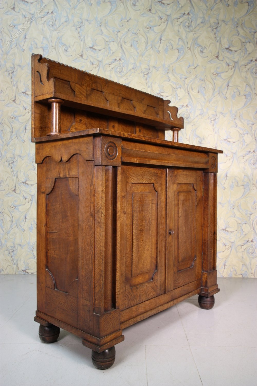 This early 19th century antique cupboard is made using wonderfully grained, wild oak. It is in super, original condition and is a beautiful colour. The Regency cupboard has a single drawer over two panelled cupboard doors, it stands on period turned feet. To the top of this lovely antique chiffonier is a shelved area that are supported by columns. A very unusual piece of Regency antique furniture that dates from around 1820.