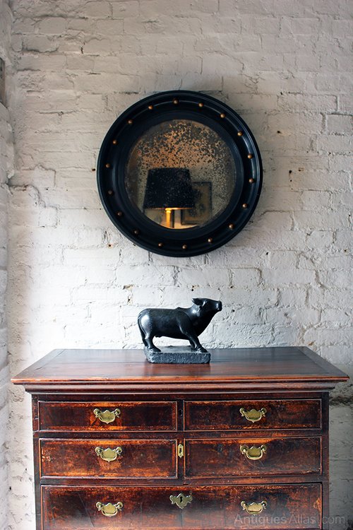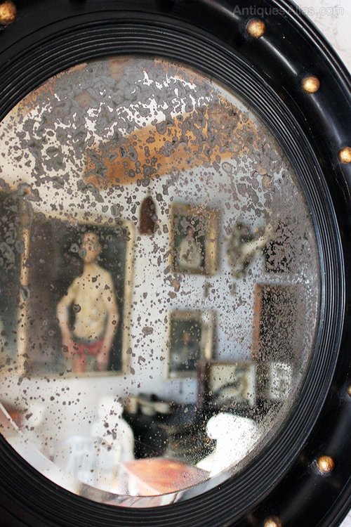 The circular porthole shape was very popular in the Regency period and appeared in many forms, often with the addition of exotic animals, flora and other decoration. This one is unusual in that the frame is ebonised and yet the corvetto balls are gilded and it has ever been thus. Dante Gabriel Rossetti had two convex mirrors rather like this in his sitting room at 16 Cheyne Walk, London.