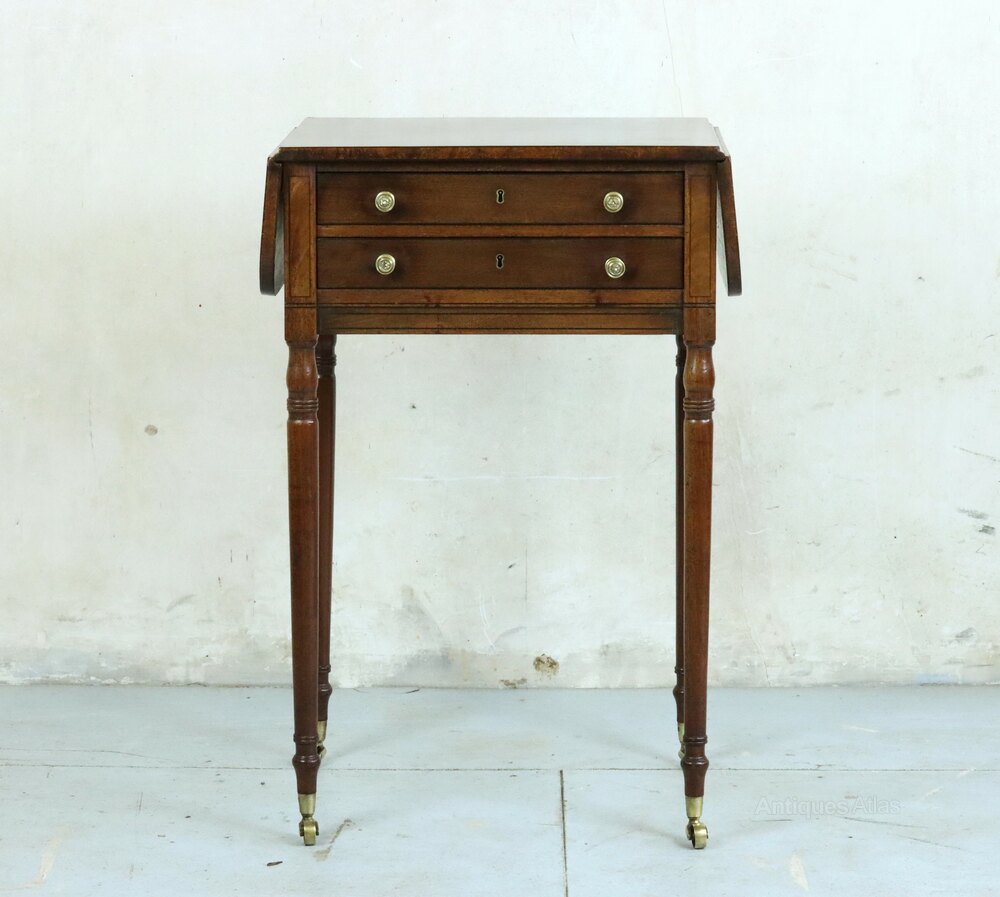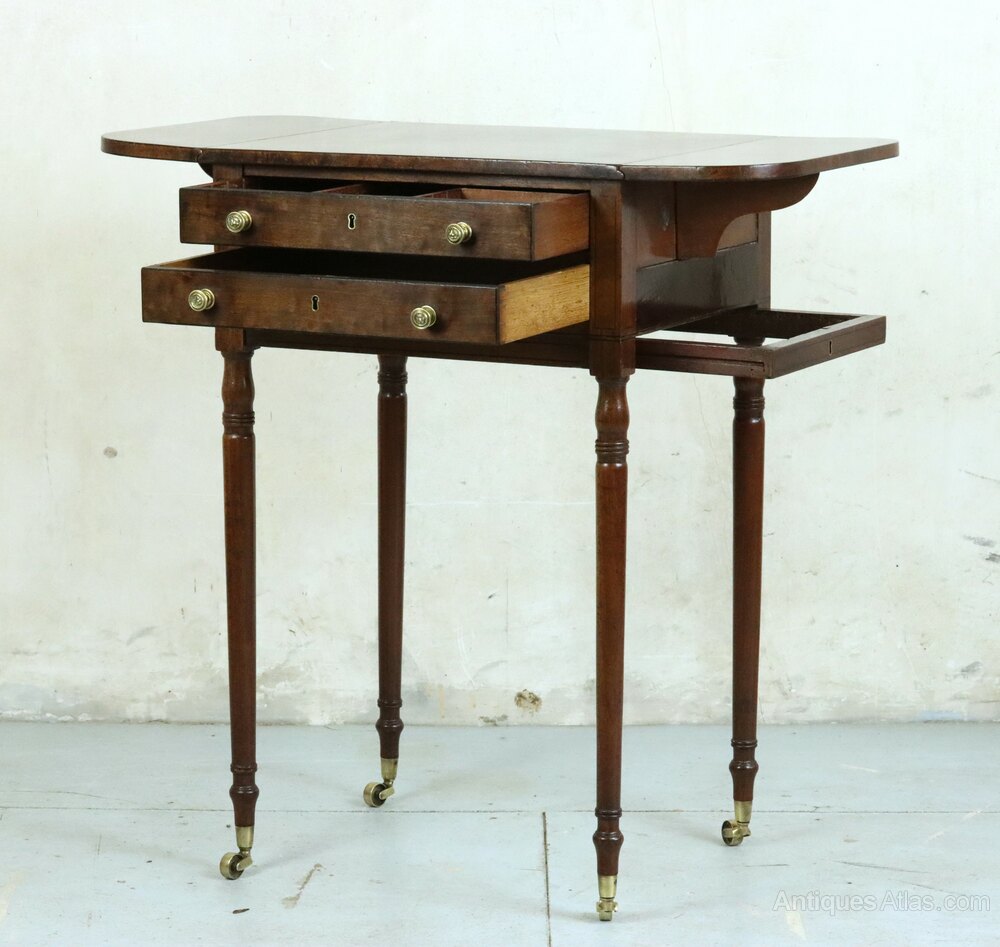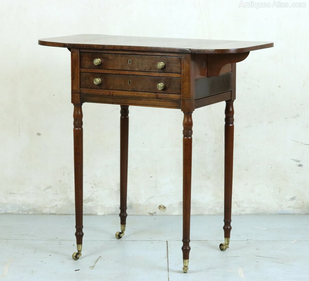 An elegant Regency ebony-lined mahogany drop flap sewing or work table in fine antique condition, which would make a useful lamp or side table for a small space. The table comprises a nicely figured (almost plum pudding in appearance) rectangular top with rounded corners above two drawers with lion mask brass knobs and a sliding frame (from the side) that would once have held a fabric bag, supported on slender turned, tapered legs ending in brass castors.