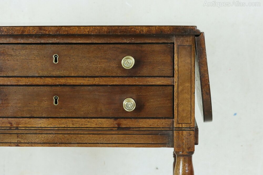 This is a fine quality table with ebony lines to top and front and ebony edges to table top and drawer fronts. The drawers are oak lined and the top drawer is compartmentalised.