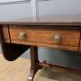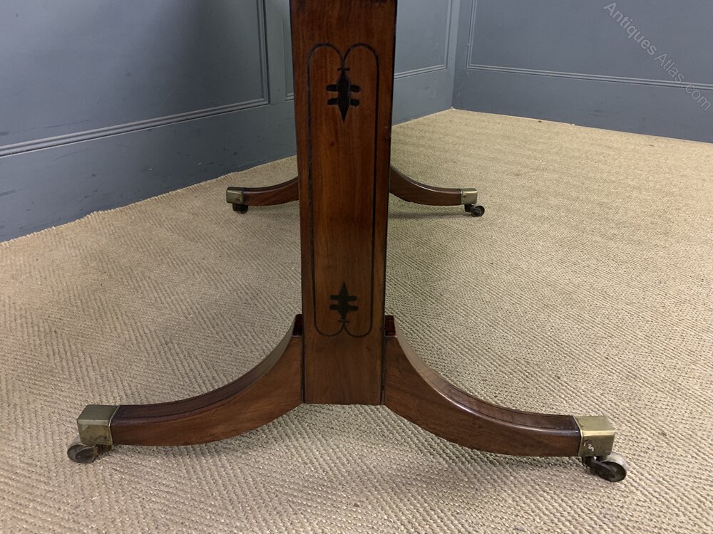 A lovely Regency period mahogany sofa table. Well constructed in solid mahogany and decorated with ebony inlay. With a pair of drawers to the front and with opposing "dummy" drawers to the rear. With a pair of lift-up flaps. Standing on splayed legs which terminate in the original brass caps and castors, united by a turned stretcher. Cleaned and waxed in our workshops and now offered for sale in very good original condition with a good colour and patina.