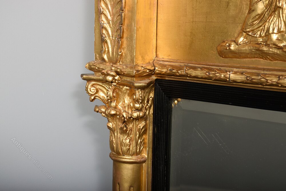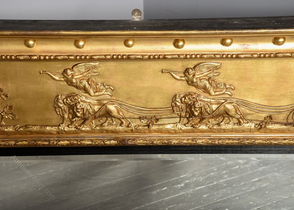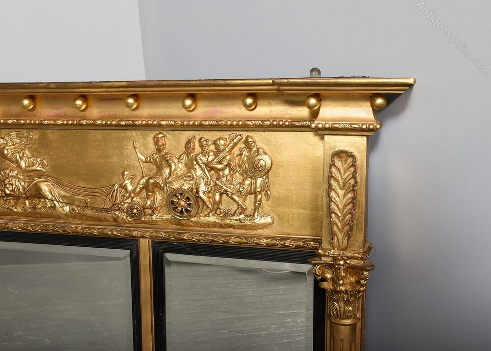 Circa 1820. A quality Regency gilded tryptic overmantel mirror, the flat top with cavetto styling beneath with gilded spheres, the frieze with classic scene of chariot with lions, winged angels and classical figures on a gilded rocky base, this is flanked by carved acanthus leaves, the three original bevel-edge mirrors contained within an ebonized ribbed slip, with the outer