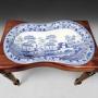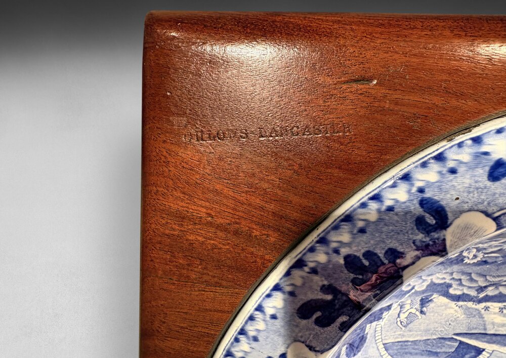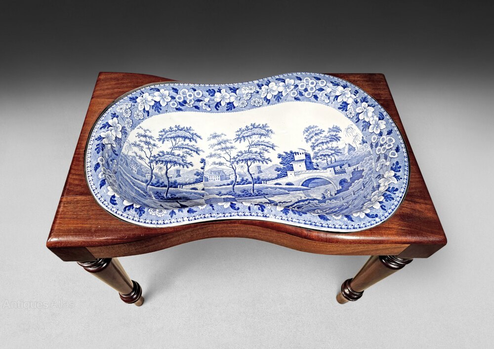 A Regency Period Mahogany rectangular Bidet Stand and Cover raised on tuned legs and opening to a Copeland and Garrett waisted pottery bidet liner decorated blue on white with the Tower pattern and with mark beneath “Copeland & Garrett Late Spode”