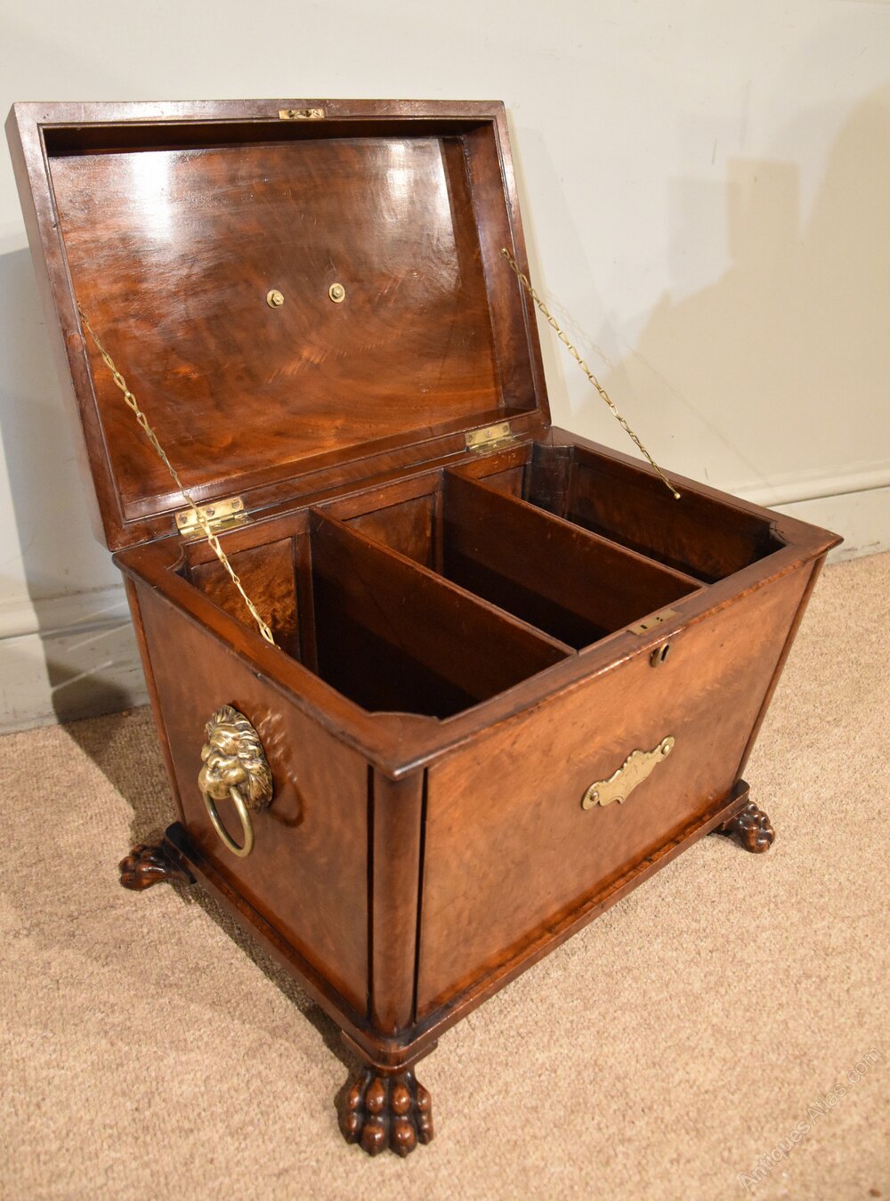 Very fine quality Regency mahogany cellarette with exquisite lion handles and with paw feet