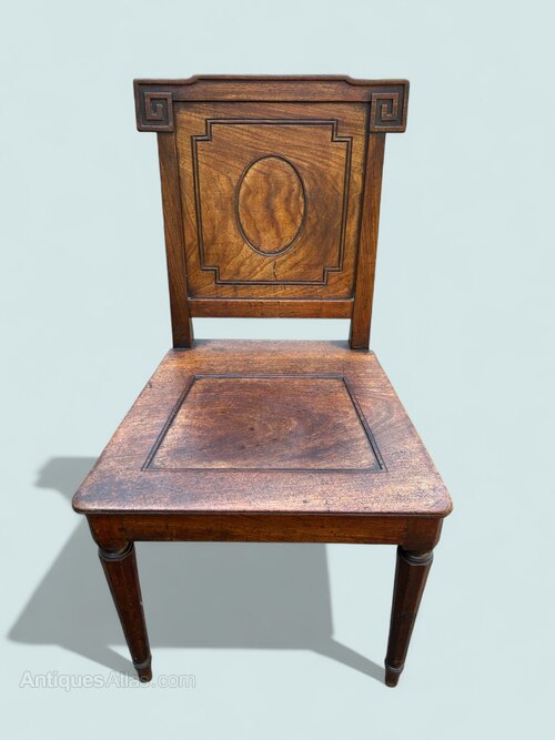 Mahogany Regency hall chair by Gillows circa 1815 with Roman and Greek architectural influences, the top cresting rail has bold Greek key decoration, the back panel has a step oval centre and moulded perimeter, the solid mahogany seat is also stepped with a reeded moulding to the edge, resting on fine octagonal tapered legs which are stamped WH the Gillows journeyman’s initials, the chair is in very good condition.