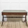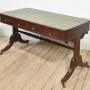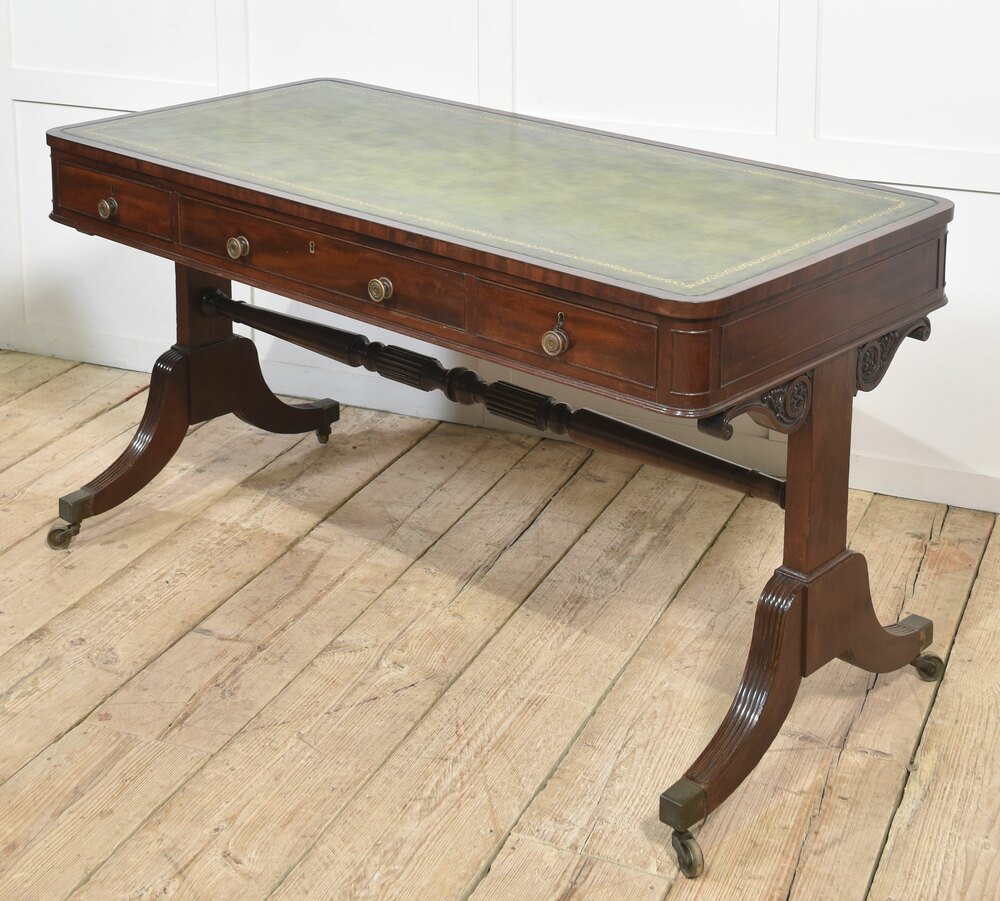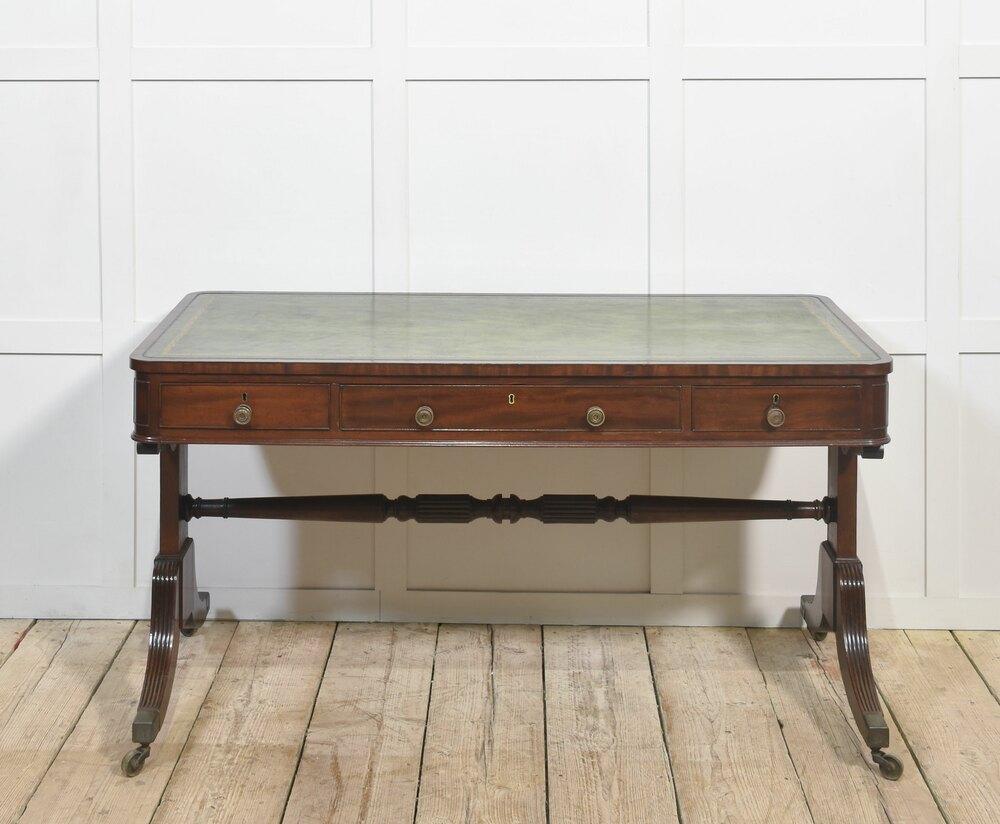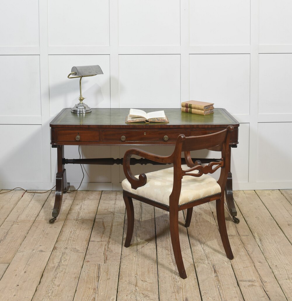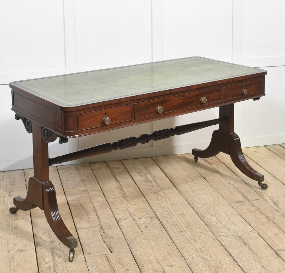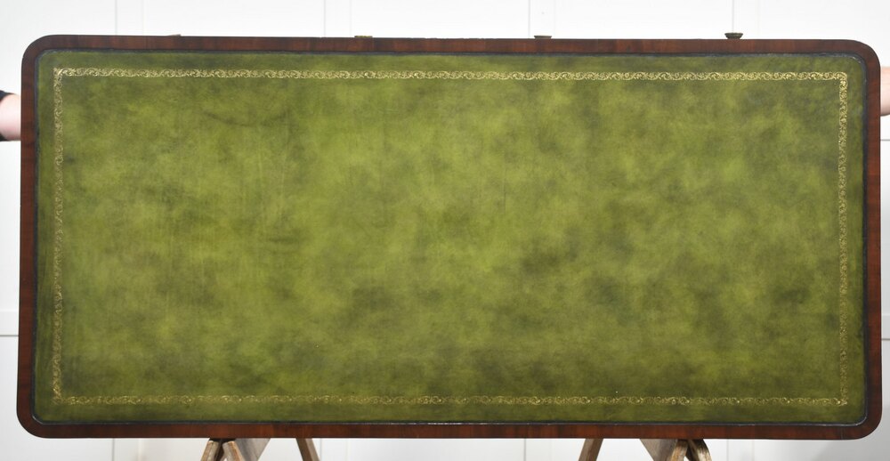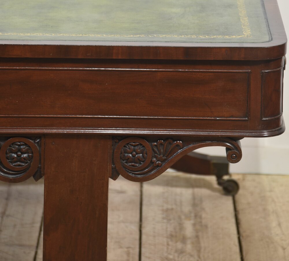 Mahogany library table, the large rectangular top with inset green leather writing surface. To the freezes having an arrangement of drawers with brass knob handles. All raised up on platform ends saber legs with brass caps and castors.