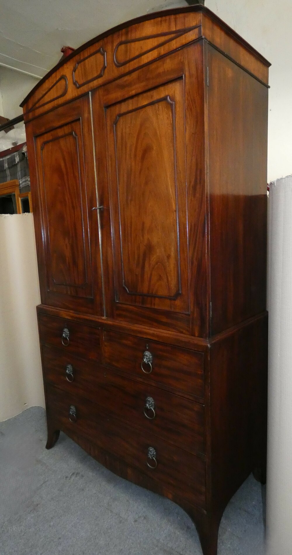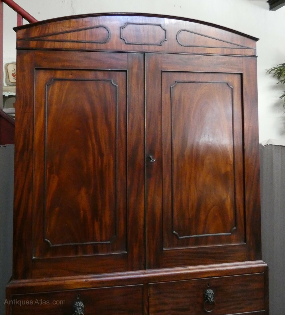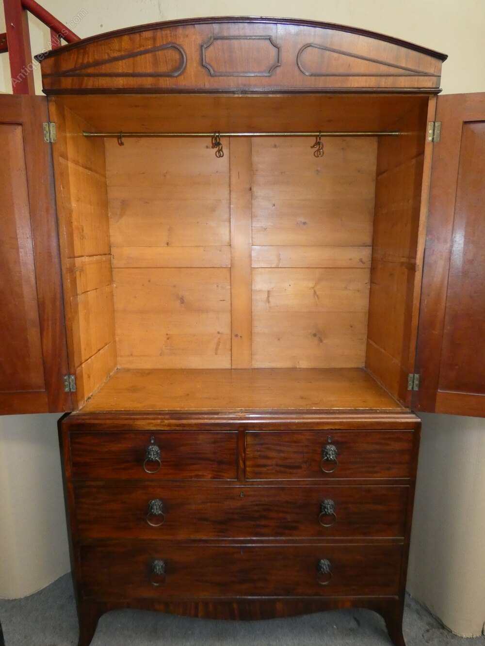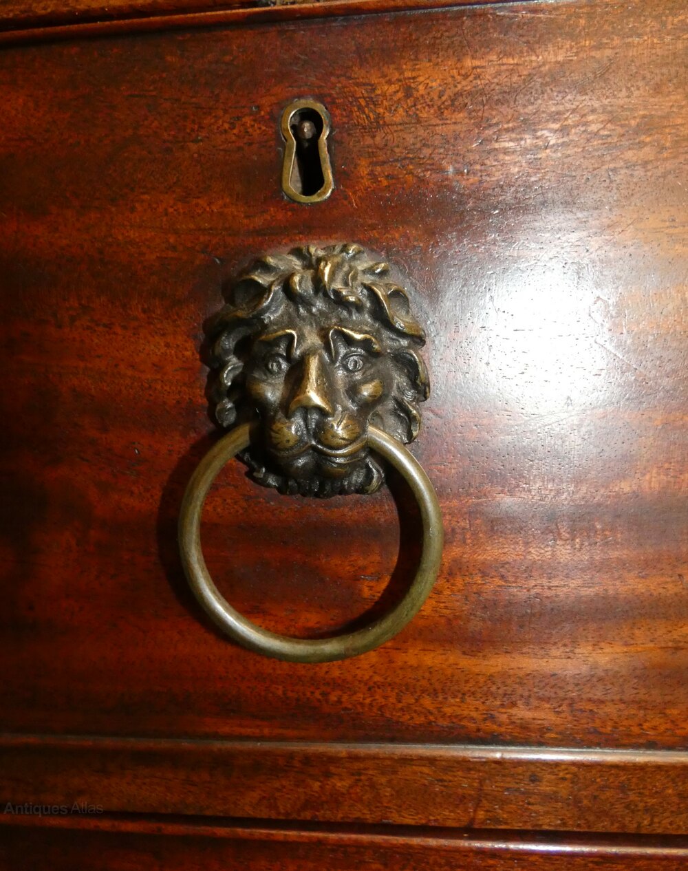 The shaped cornice with moulded decorations over two panelled doors opening to interior fitted with a brass hanging rail. The base with two short drawers and two long drawers, all with fabulous lion mask handles, shaped apron and raised on splay feet.
