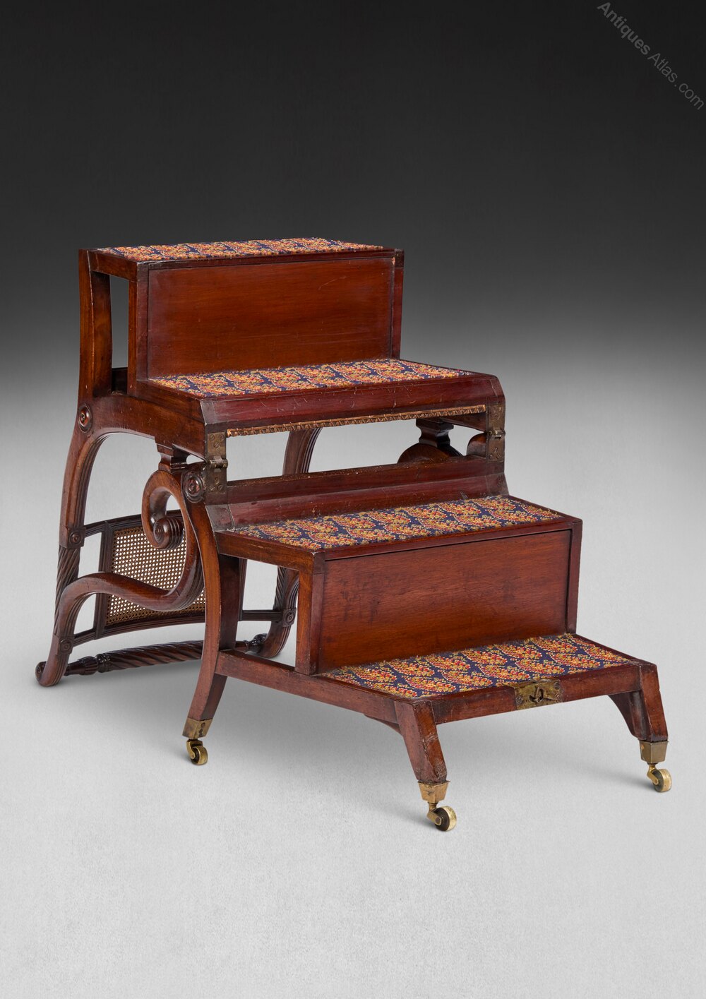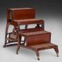 Ackermann`s Repository of the Arts, Series 1, Volume 6, Plate 3, Page 40, July 1811 “Metamorphic Library Chair, Under this head we this month present our readers with a representation and description of a truly novel and useful article called the Metamorphic Library Chair. This Chair, which forms at the same time, a complete set of library steps, is considered the best and handsomest article ever yet invented, where two complete pieces of furniture are combined in one – an elegant and truly comfortable armchair and set of library steps. The latter is as firm, safe and solid as a rock, and may, with the greatest ease, by merely lifting up with the right hand the back of the chair, be metamorphosed into a complete an armchairs can be wished for. It may be made of Mahogany or any other wood and to any shape or size, either as represented in the plate, or with caned back and sides, and French stuffed cushions covered with Morocco leather &c. This ingenious piece of furniture is manufactured at Messrs. Morgan and Saunders`s, Catherine-st. Strand.”