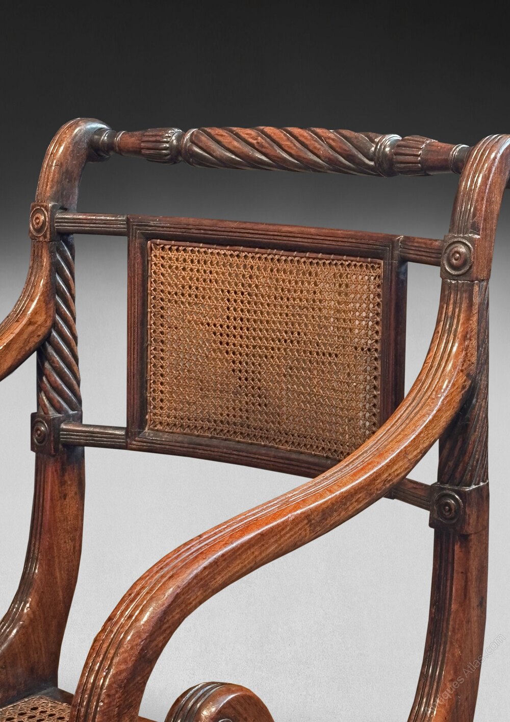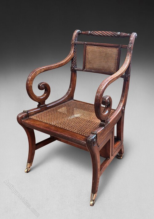 A Regency Mahogany Metamorphic Library Armchair/Steps with a caned back and seat beneath a rope or cable twist carved top rail, flanked by reeded scrolling arms and rope twist and reeded uprights, the reeded front rail seat opening to a set of carpet lined steps, raised on square reeded and sabred legs with brass caps and castors
