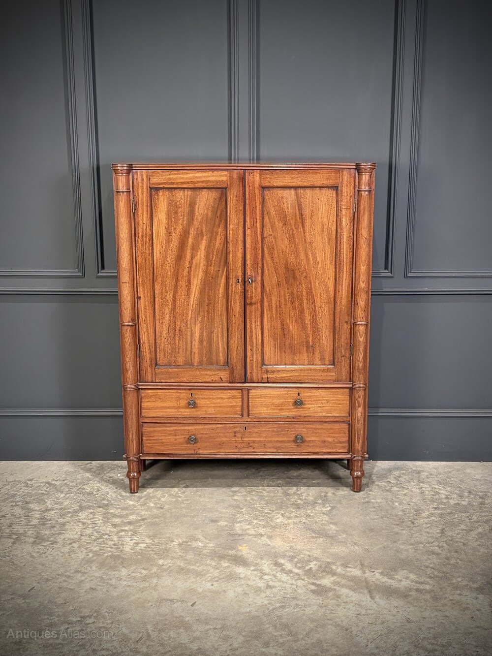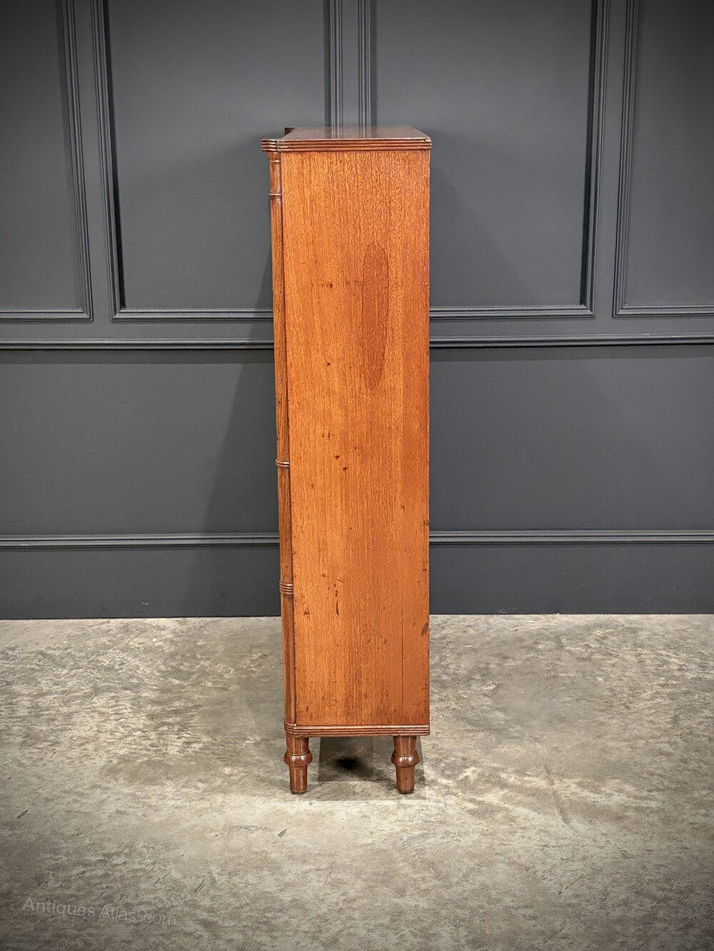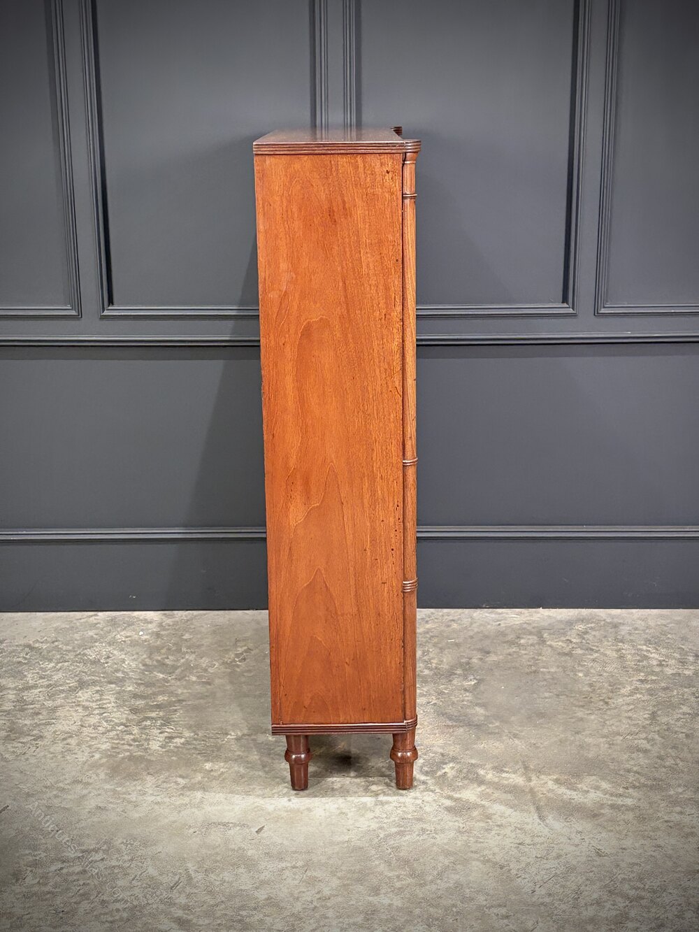 The piece is enhanced by finely executed ring-turned details to the front pilasters, which terminate in neat turned feet.