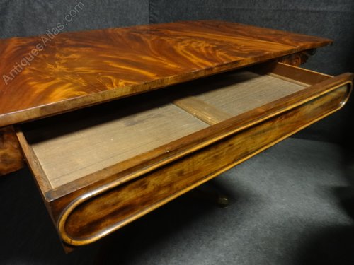 A very good Regency sofa table, flame mahogany top, standing on centre pedestal and platform base with sabre legs and brass toes and castors, single full width drawer, excellent colour and condition.