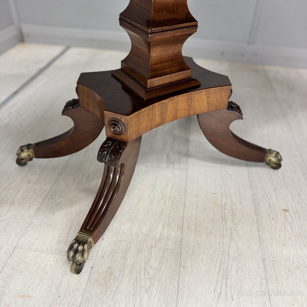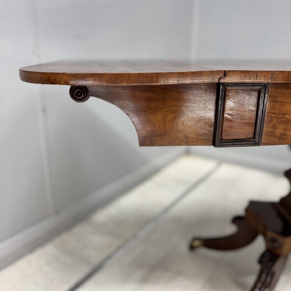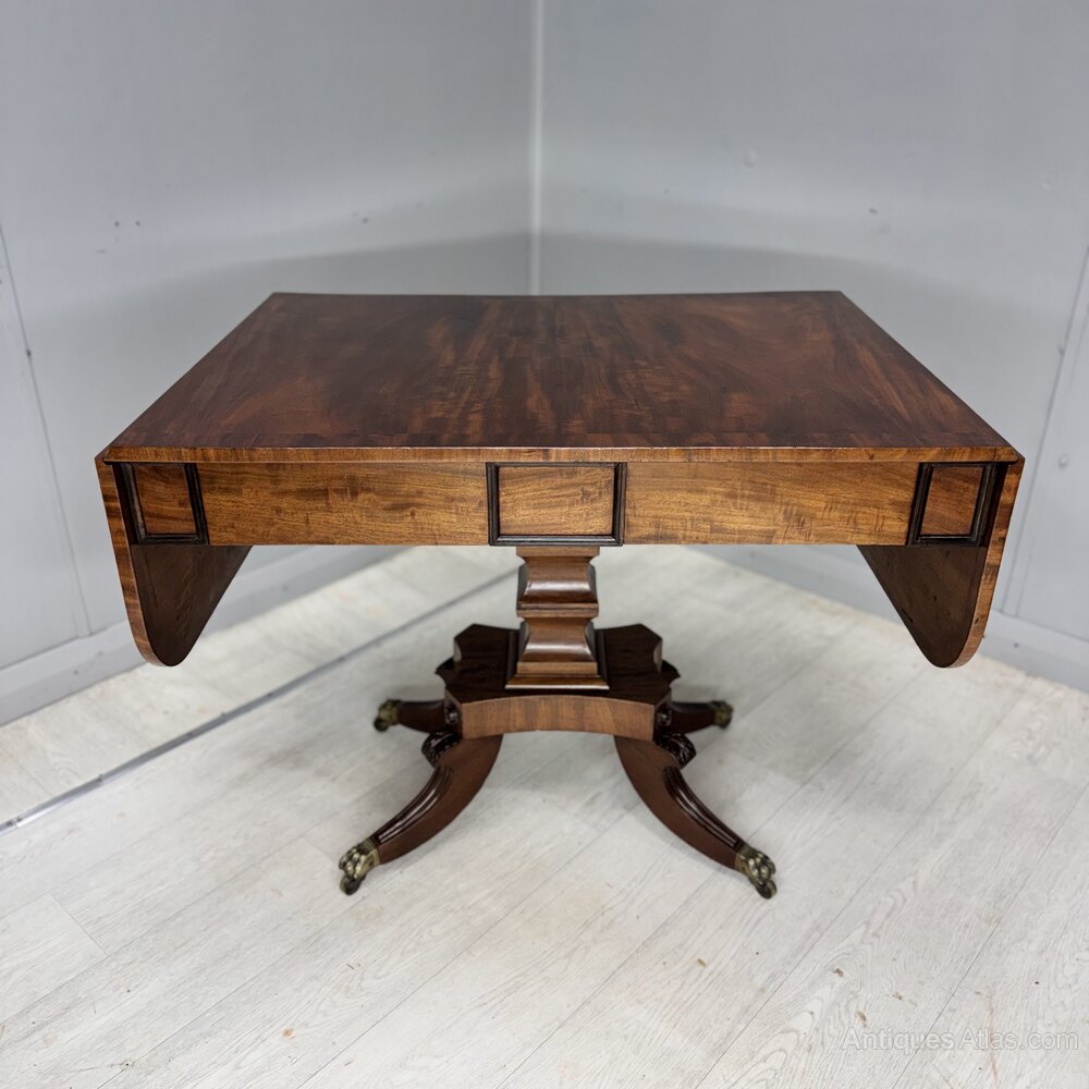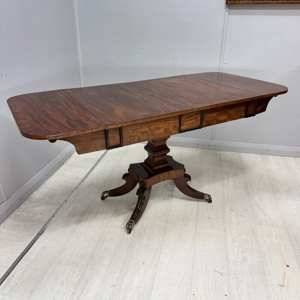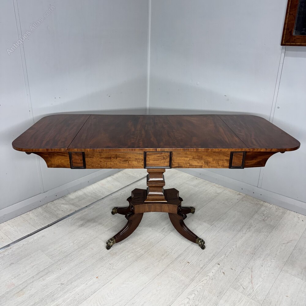 Very elegant late Georgian to Regency period mahogany banded drop leaf sofa table with two drawers, ebonised mouldings, a pedestal column and splayed legs on original brass lions paw castors, circa 1820 and in good condition.