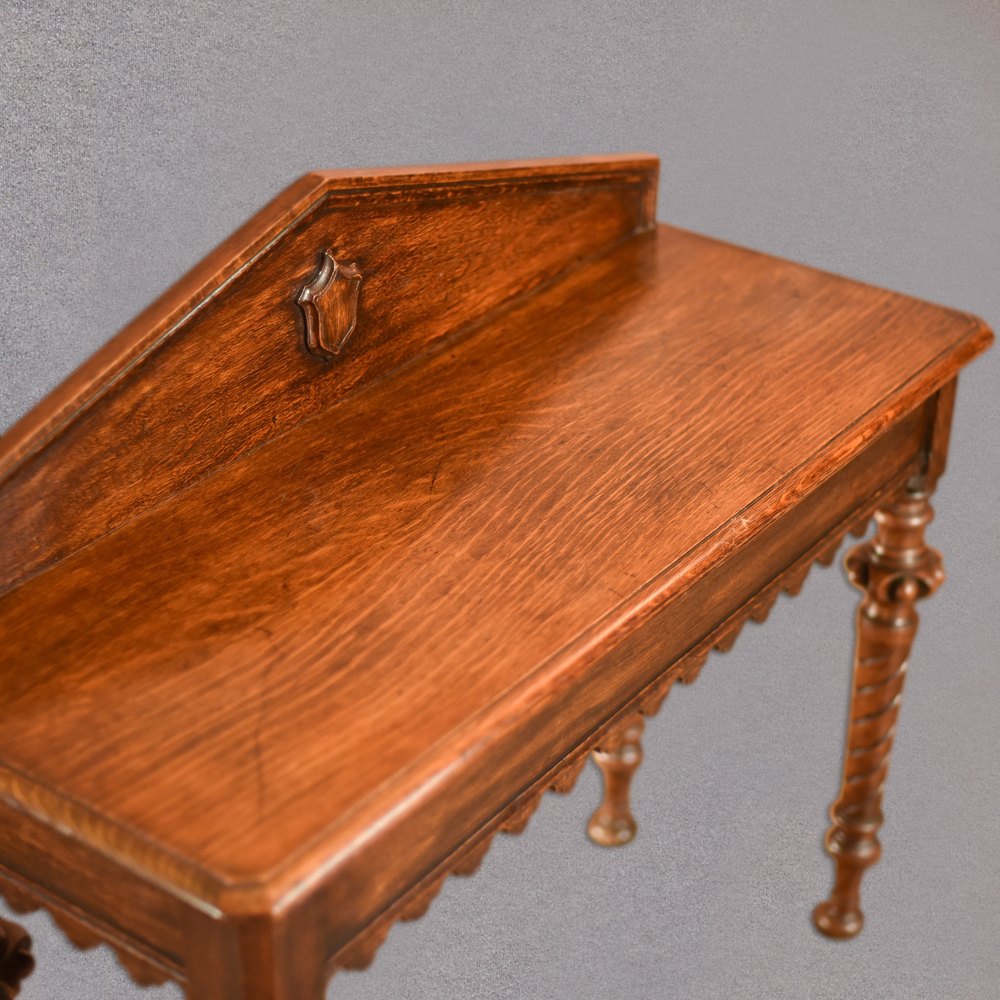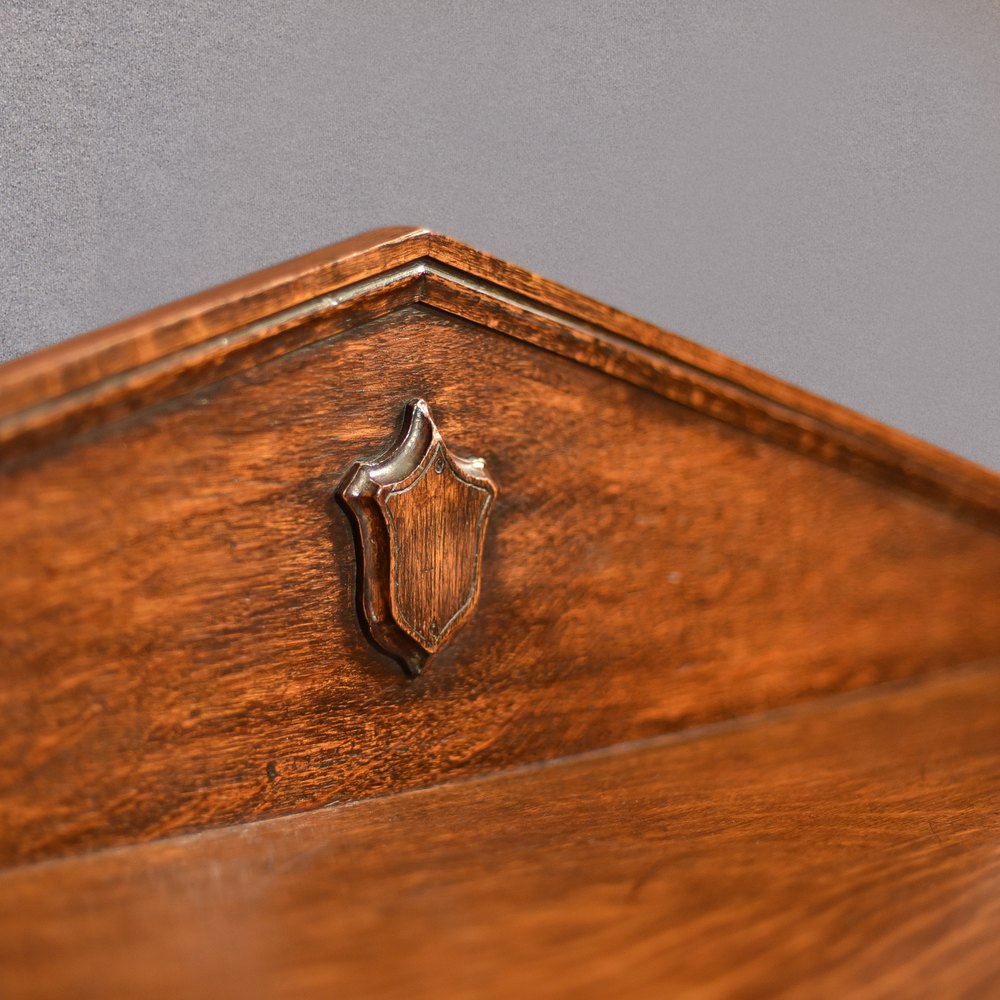 The top is in fine order and displays attractive graining with a moulded edge detail and canted corners. To the rear, a generous pitched up-stand is decorated with a carved shield motif and moulded edge.