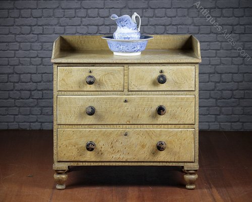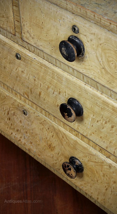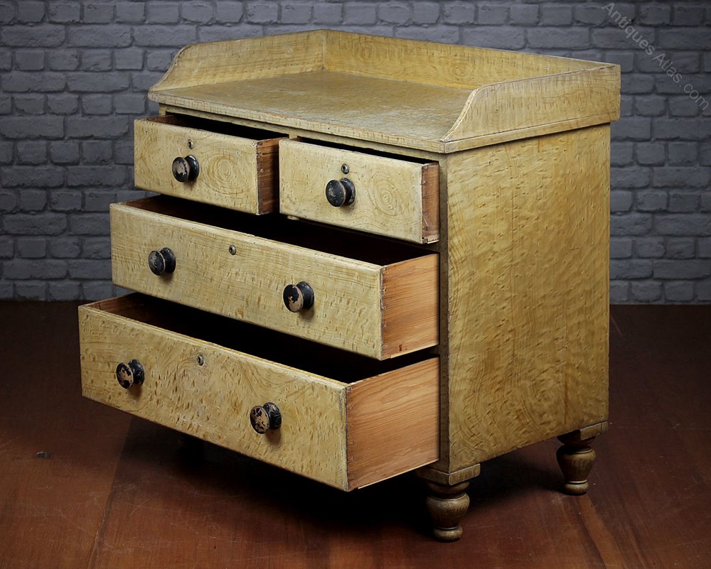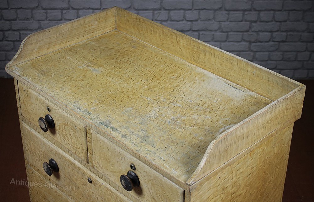 Charming little Regency era painted pine chest of drawers c.1830. Top with a useful upstand or splash back over two short and two long drawers with turned knobs and brass escutcheons. Excellent condition retaining the original scumbled paintwork, original locks and turned feet.