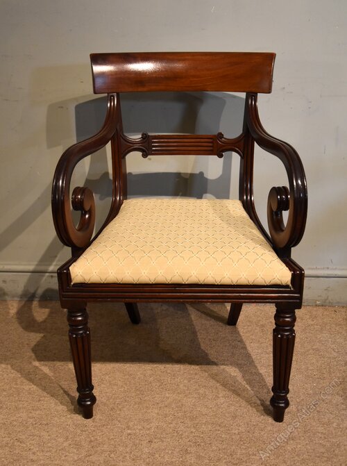 A Regency period mahogany scroll armchair of good design and colour. Raised upon reeded legs.