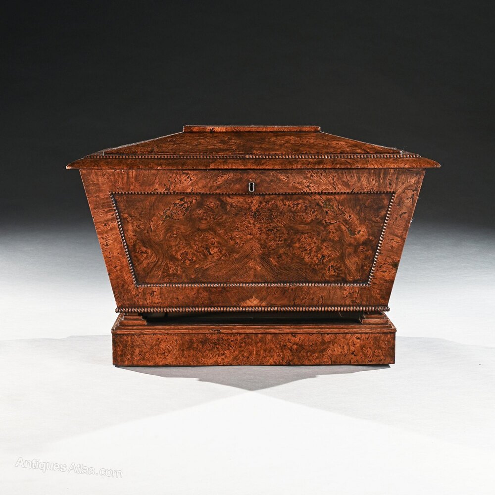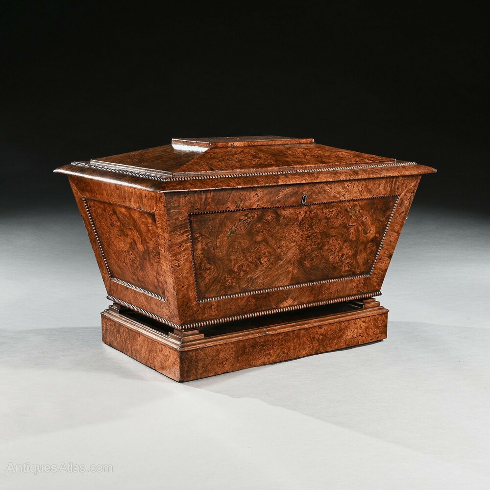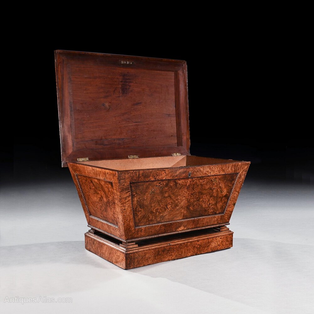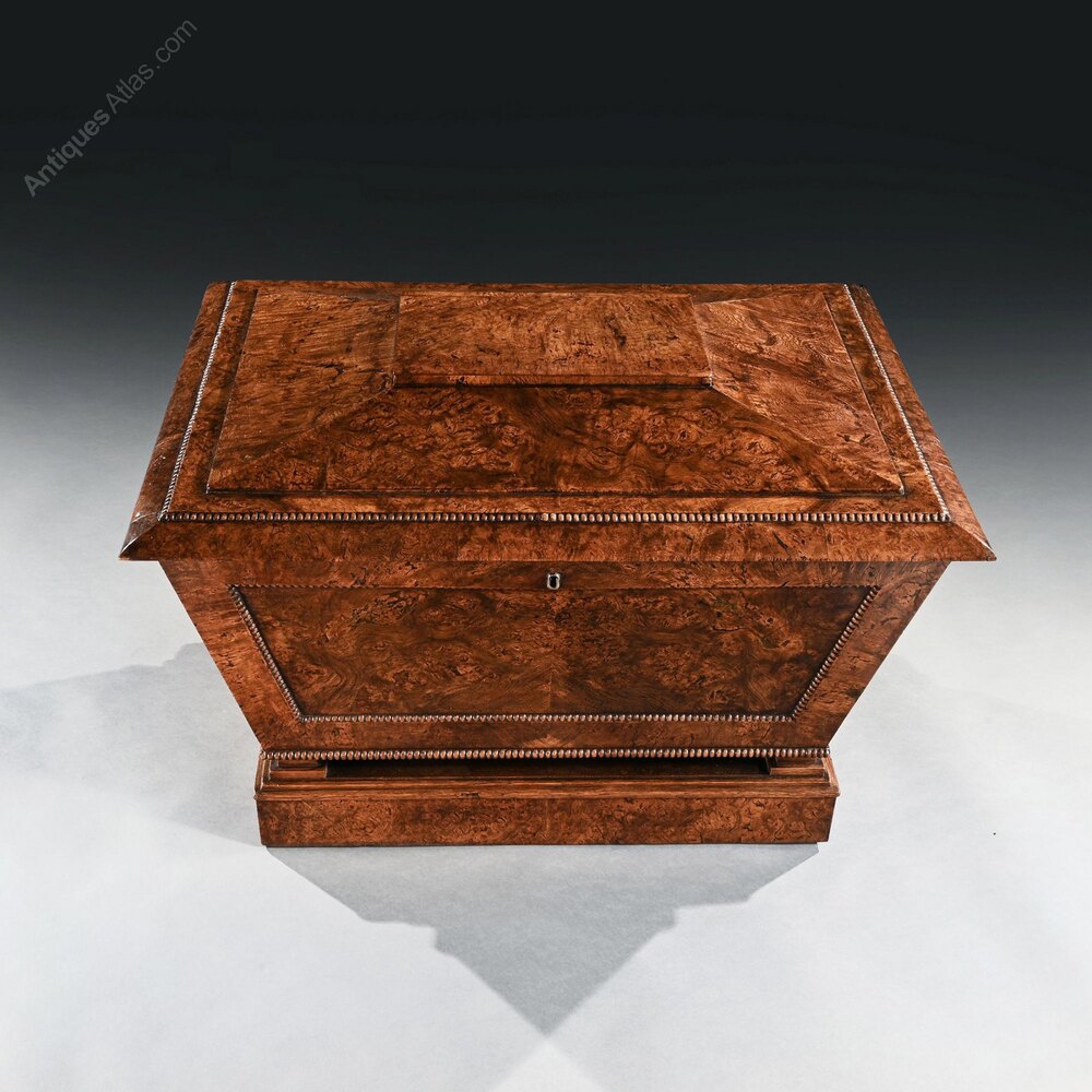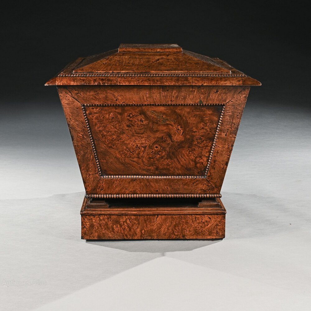 Designed in the Greek revival classical manner, the piece takes its basic form from classical sarcophagi with a tapering, flattened pyramidal top. The fact that the piece has a lid and is not open technically makes it a cellarette a closed wine cooler, designed to keep bottles cool with ice packed around them in the grand dining rooms of the great regency period houses. The piece is quite unusual in that it has stepped square feet above an integral platform base, the base incorporating concealed castors for ease of movement which is a very useful feature when full of wine!