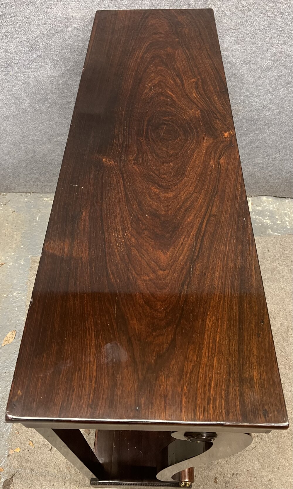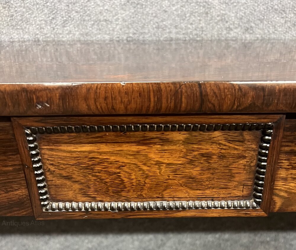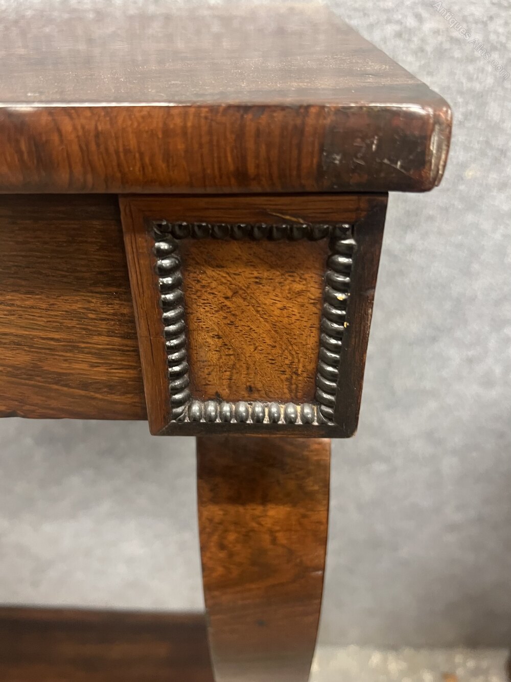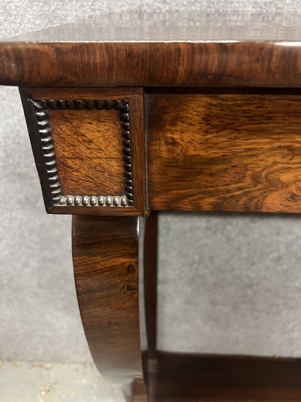 An attractive Regency rosewood console table. The rectangular shaped top above a decorative frieze with raised square and quarter turned beaded stiles and conforming centre. The table is raised on elegant shaped and tapering front legs with gilded brass mounts and square back legs all joining the platform base with further applied quarter turnings. Condition very good with or two bumps associated with age and use. Dimensions:- Height…34.5’’/ 87cm. Width…45’’/ 114cm. Depth…14’’/ 35.5cm. Delivery by furniture carrier to most of U.K. £55.
