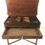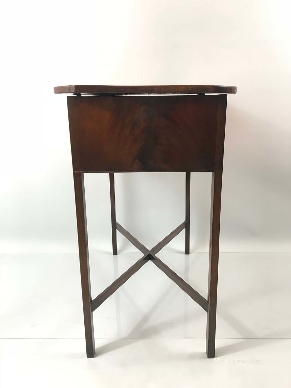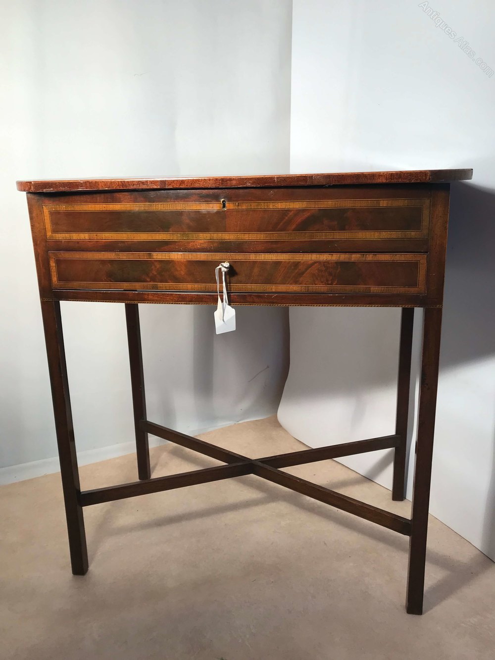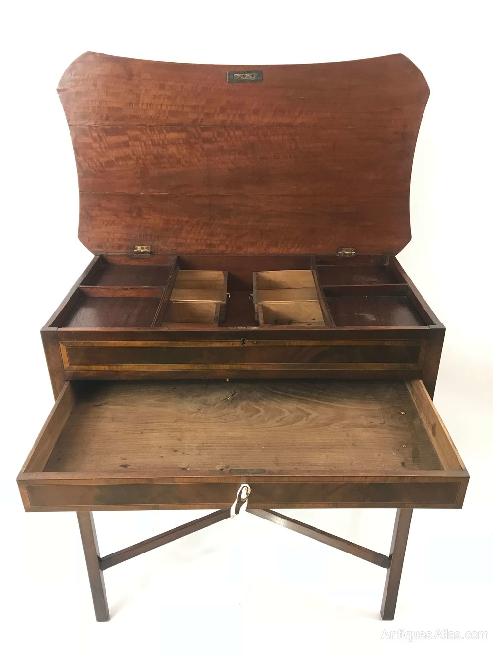 A striking, beautifully made, Regency side table with storage under a hinged top and a secret drawer beneath. Quality construction with fine veneers. Auction: An early 19th century inlaid mahogany table with shaped rectangular lift up top, fitted interior with single drawer on square legs united by an X-stretcher. Height 78cm, depth 45cm, width 76cm.