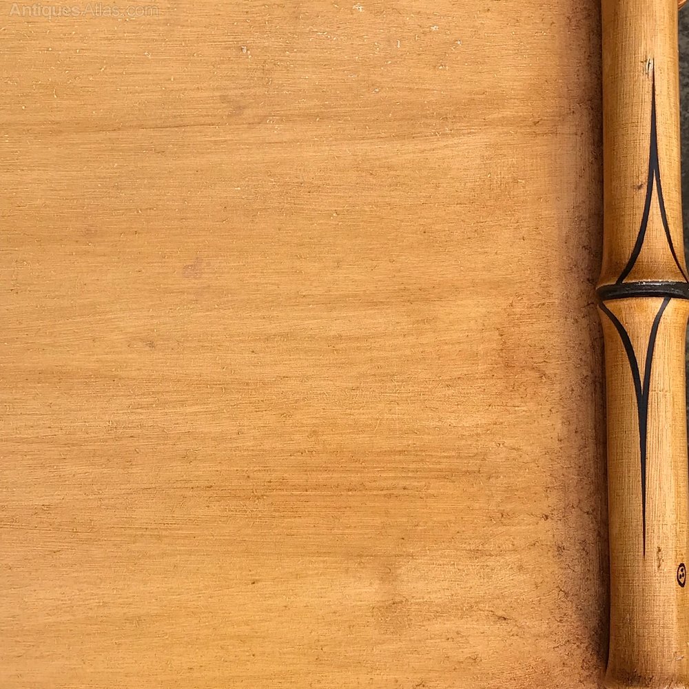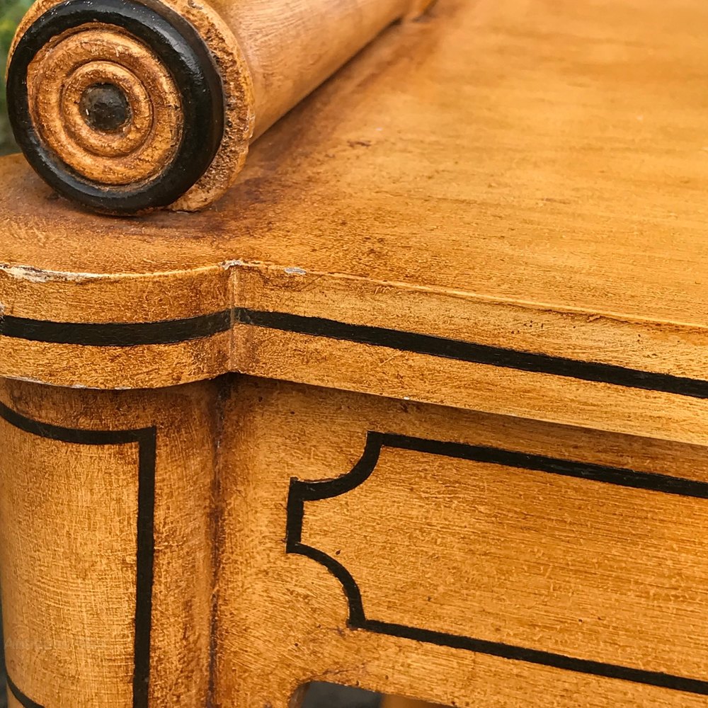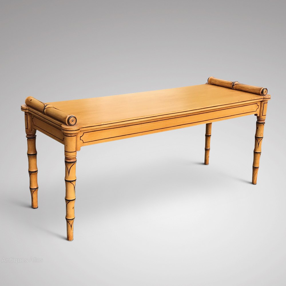 A mid century hall bench/window seat in the Regency style with roll ends, standing on faux bamboo legs. The yellow tone paint is highlighted with black detail, giving a very smart look to the piece. The condition is good, there is a faint mark to the top, this is very hard to see and does not distract from the appearance of this striking piece. A very decorative and distinctive seat, easy to place in any interior.