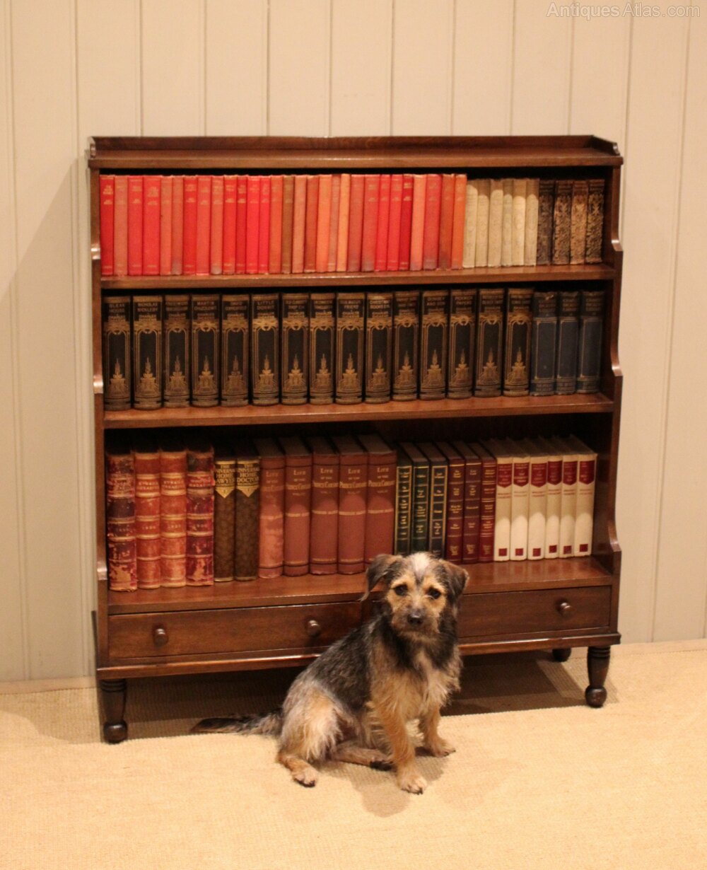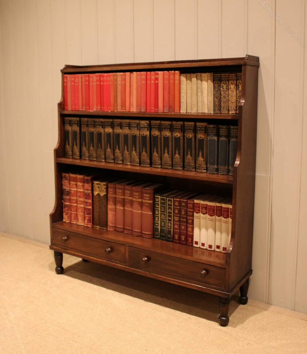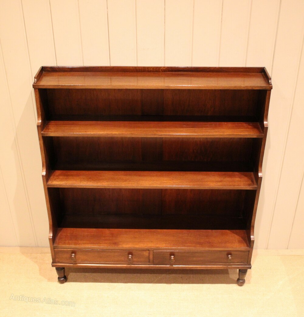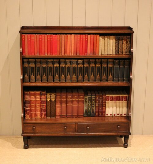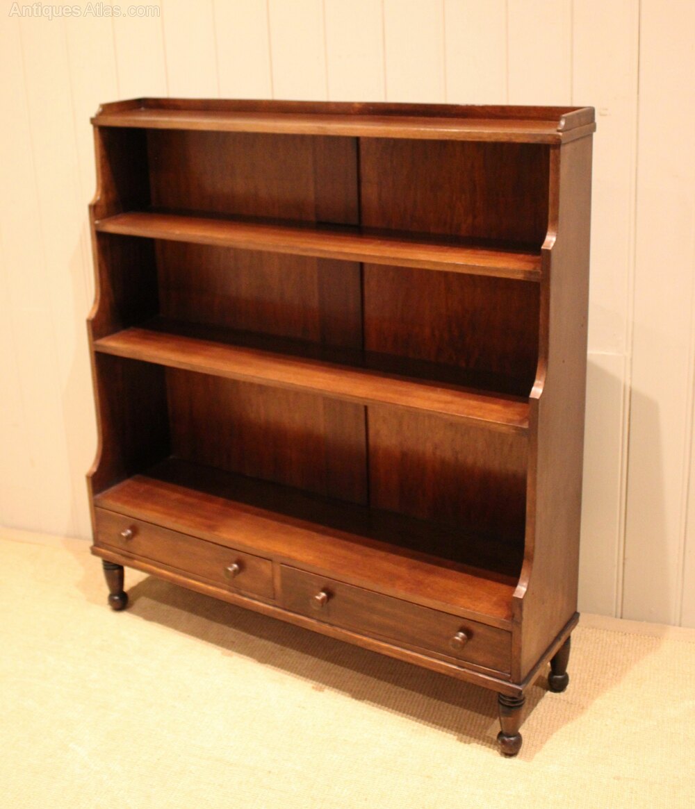 Regency style open bookcase having three graduated shelves with a pair of drawers to the base , raised on bracket feet . The shelf dimensions are 92 cm wide and from the bottom up 24.5 cm deep x 30.5 cm high , 20 cm deep x 22.5 cm high and at the top 16.5 cm deep x 18.5 cm high .