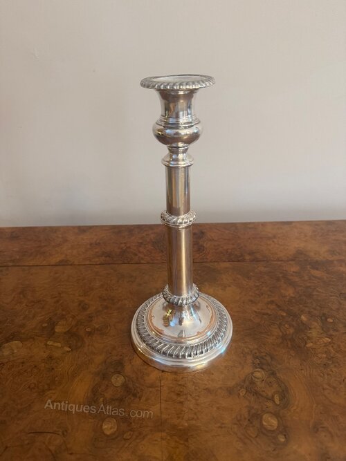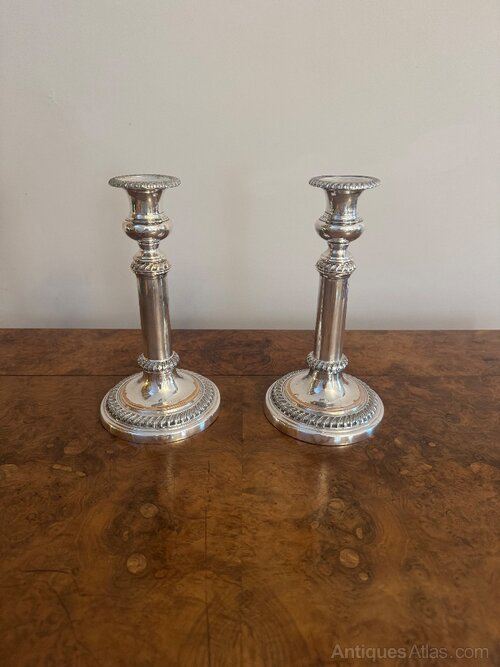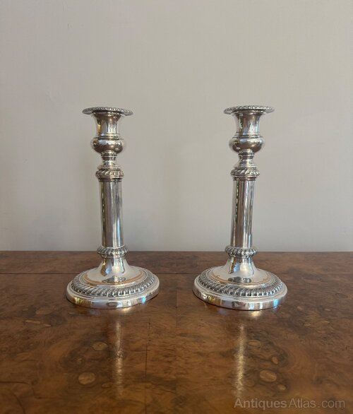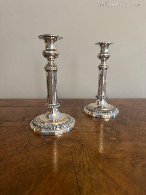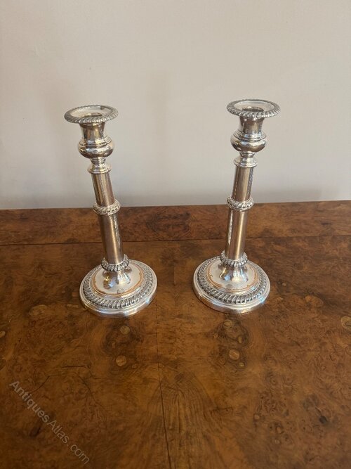 Quality pair of antique Regency telescopic Sheffield plated candlesticks having a quality pair of antique Regency telescopic Sheffield plated candlesticks with an ornate turned column on a circular stepped base.