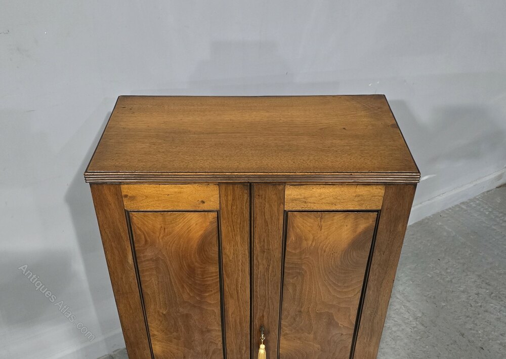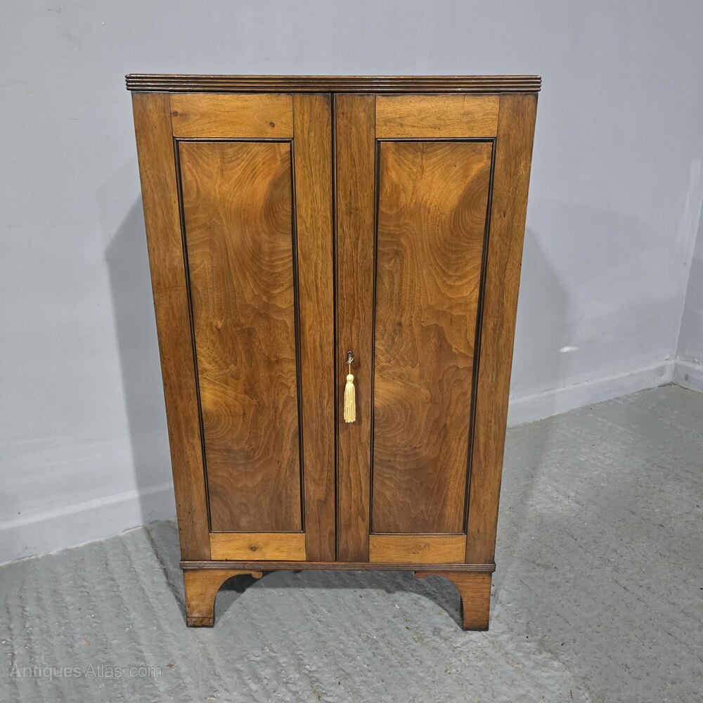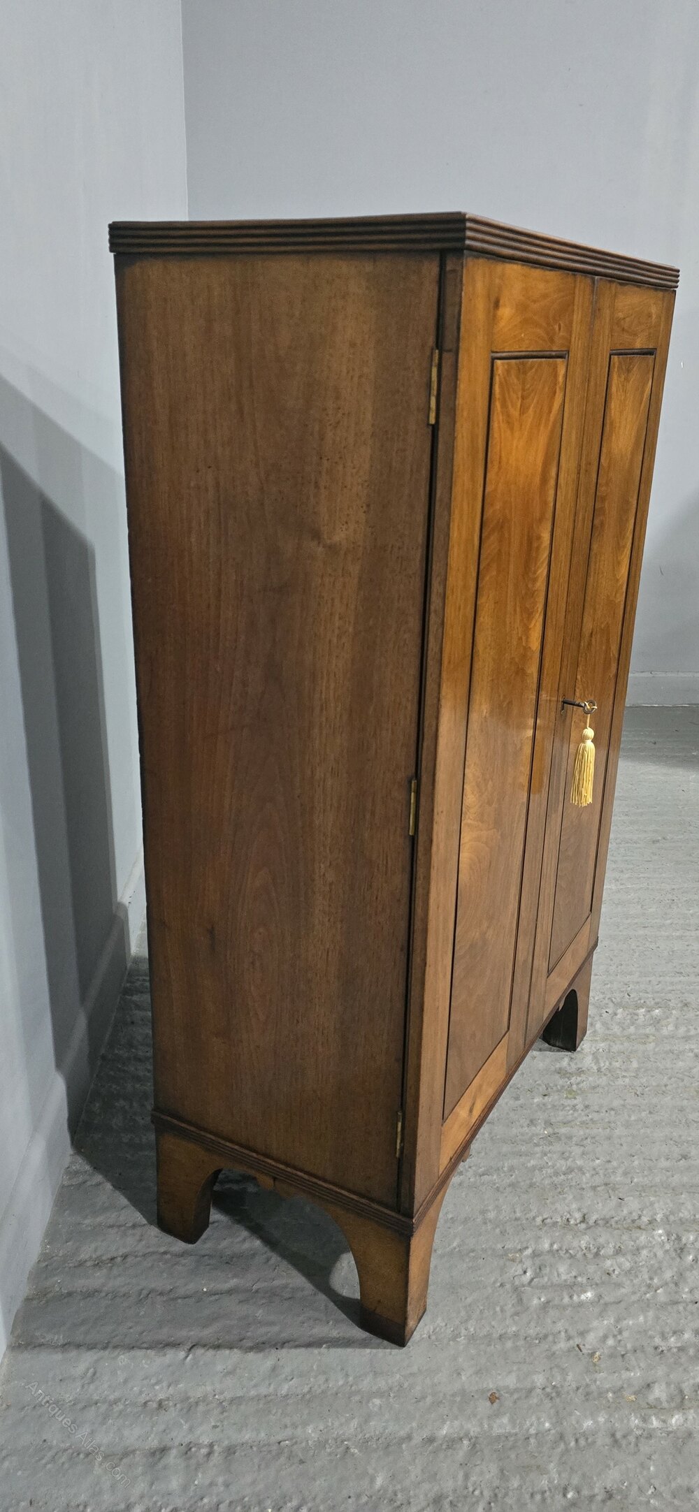 Excellent quality walnut two door cabinet on bracket feet, three fixed shelves, in excellent overall condition.