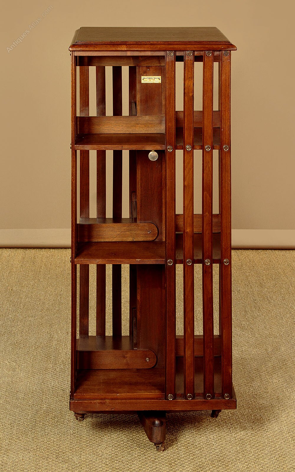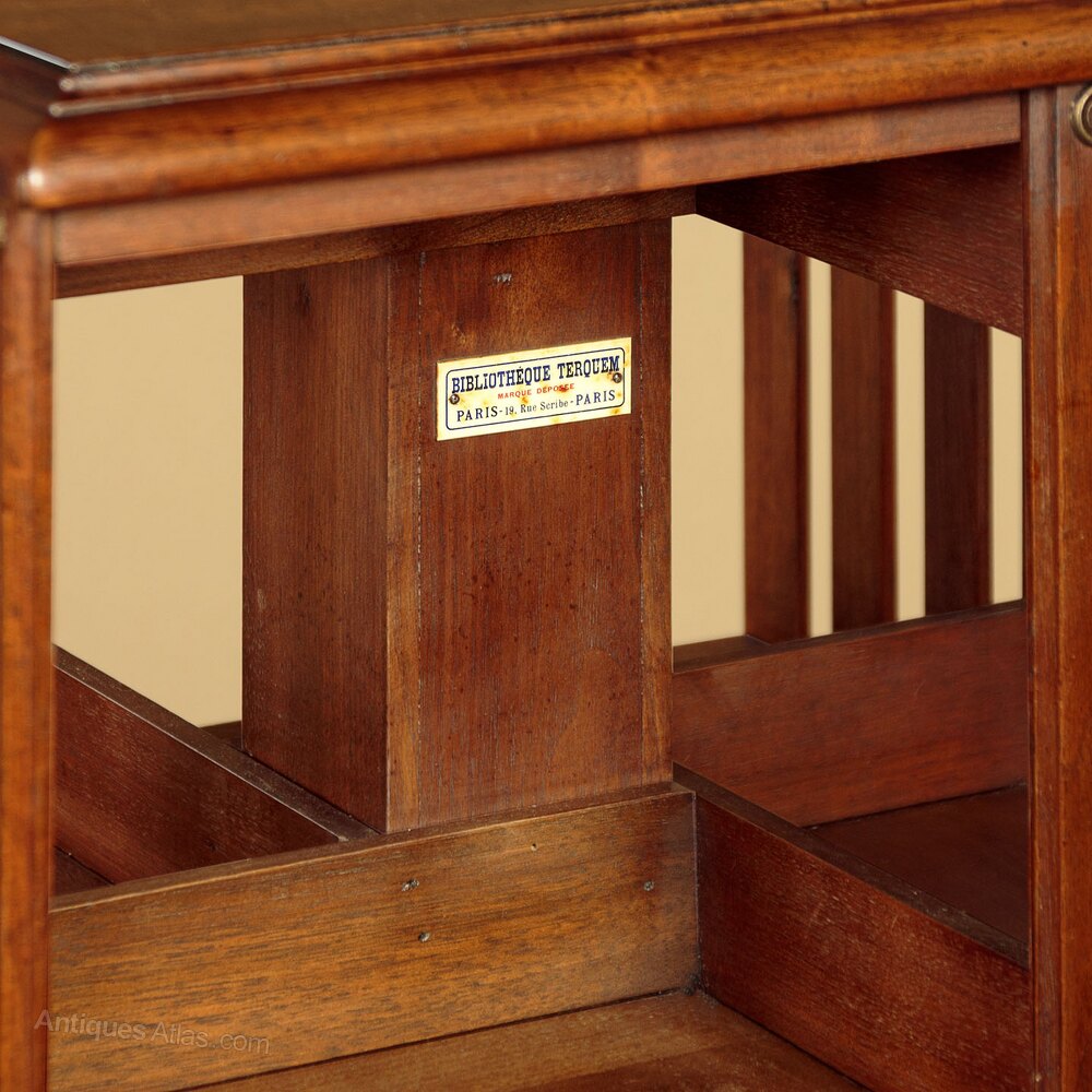 Smart French mahogany revolving bookcase with some unusual features by Bibliotheque Terquem of Paris c.1910. Slimmer than many we see, with a 17½" square top with a moulded edge over three tiers of shelves of graduated height (width 10", depth 6") affording over 10 feet of shelf space for books etc. Hinged dividers at the back of each shelf can be moved out of the way so larger books can be accommodated. Moulded slats to the sides. Revolving on a cross base with original metal castors. Also with an unusual brass screw mechanism which can be tightened to stop the bookcase revolving if desired. Original maker's badge to the square column at the centre. Excellent colour and condition, cleaned and waxed in our workshops.