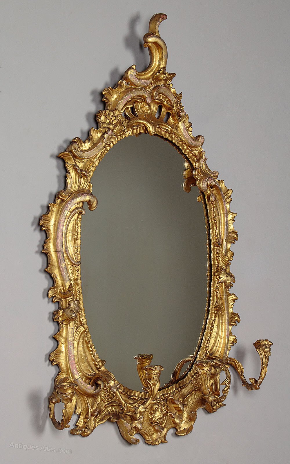 Late 19th.c. Rococo revival girandole wall mirror c.1870. 15½" x 23½" oval mirror plate within an elaborate carved and gilded wood and gesso frame with scrolling foliate decoration. With four candle holders on shapely curving branches to the bottom edge. Original gilding with some obvious wear in places and some minor damage to the gesso toward the top of the frame. Note the right hand candle holder is unfortunately bent rather out of shape.