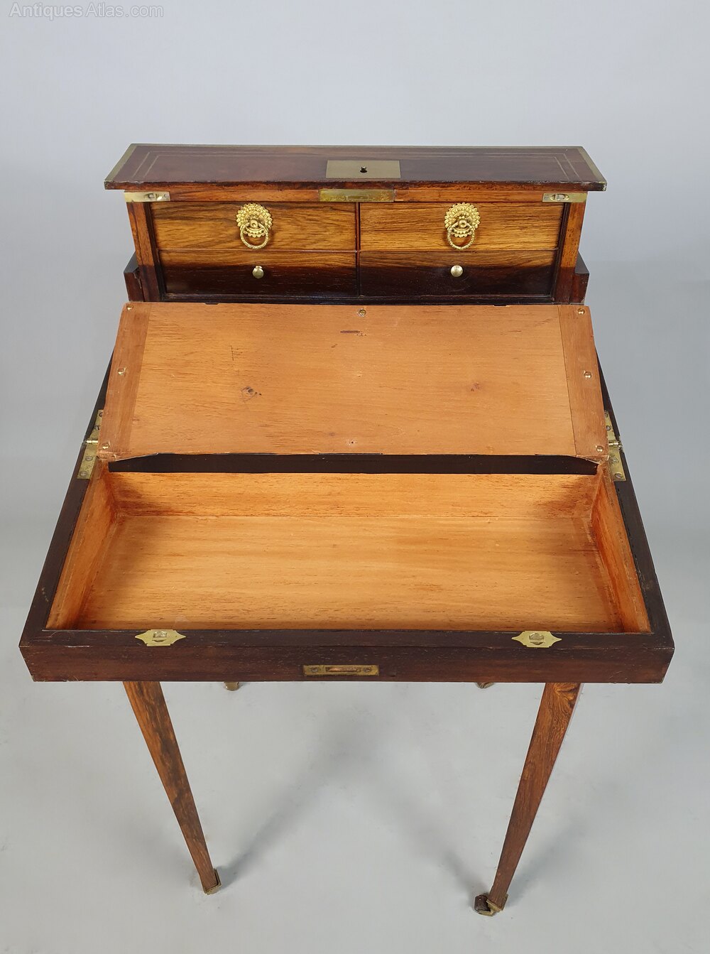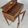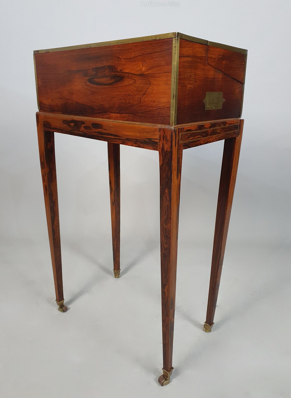 The matching rosewood stand with original brass casters is also inset with brass stringing and has a cantilever mechanism whereby the front two legs hinge forwards to support the desk when in use. There is a raised integral border on three sides of the stand which the box fits precisely into.
