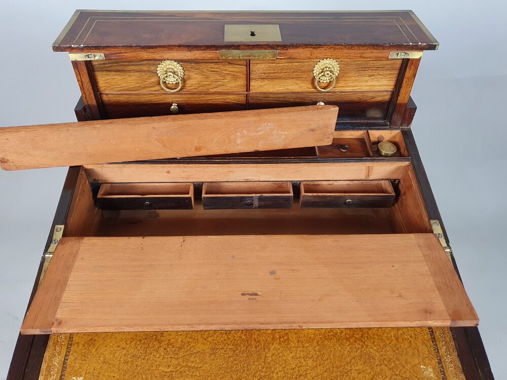 An extremely high quality campaign desk on original stand. The solid rosewood desk is inset with brass stringing and has brass bound borders and with inset brass side handles so that the desk and stand can be transported quickly and separately.