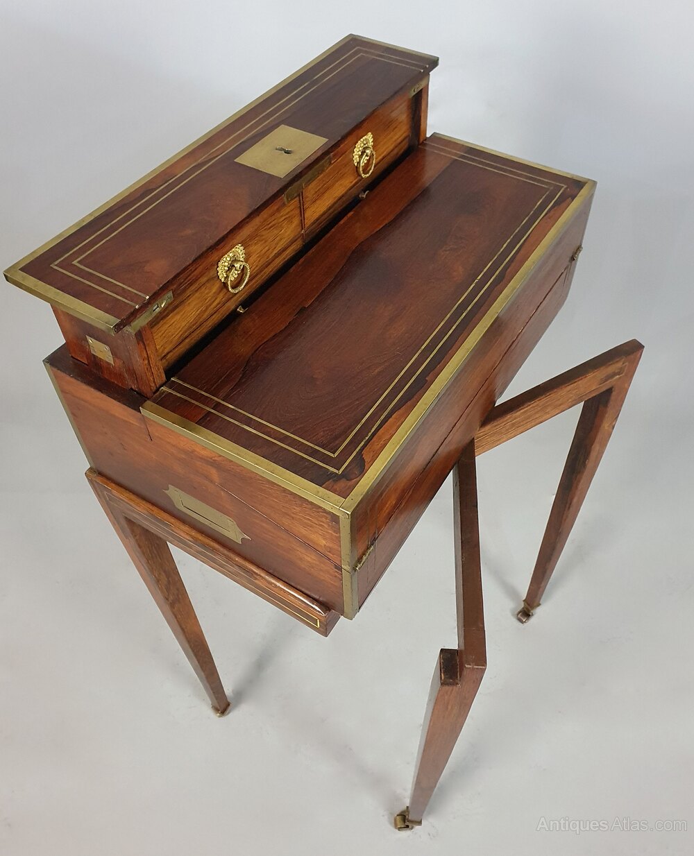 Rosewood and Brass Inlaid Campaign Desk on Stand