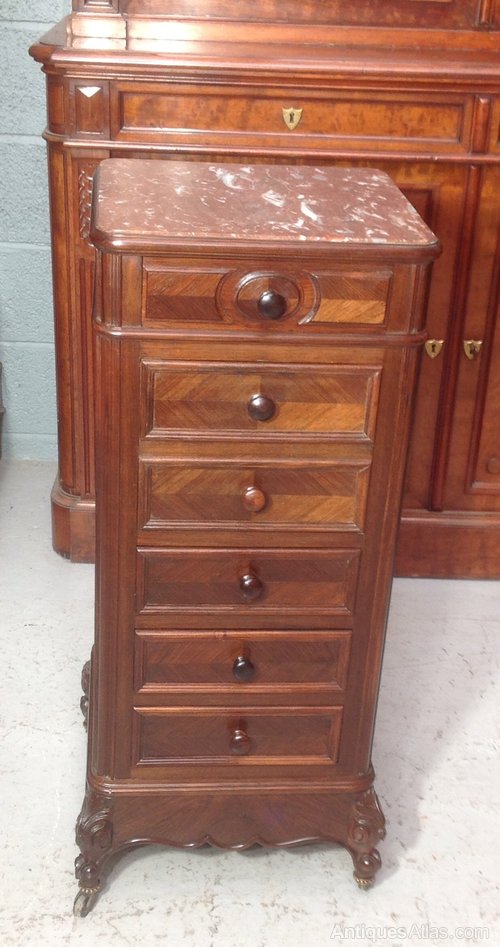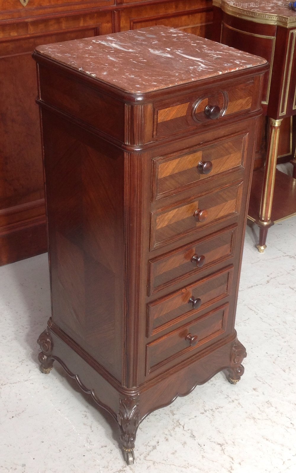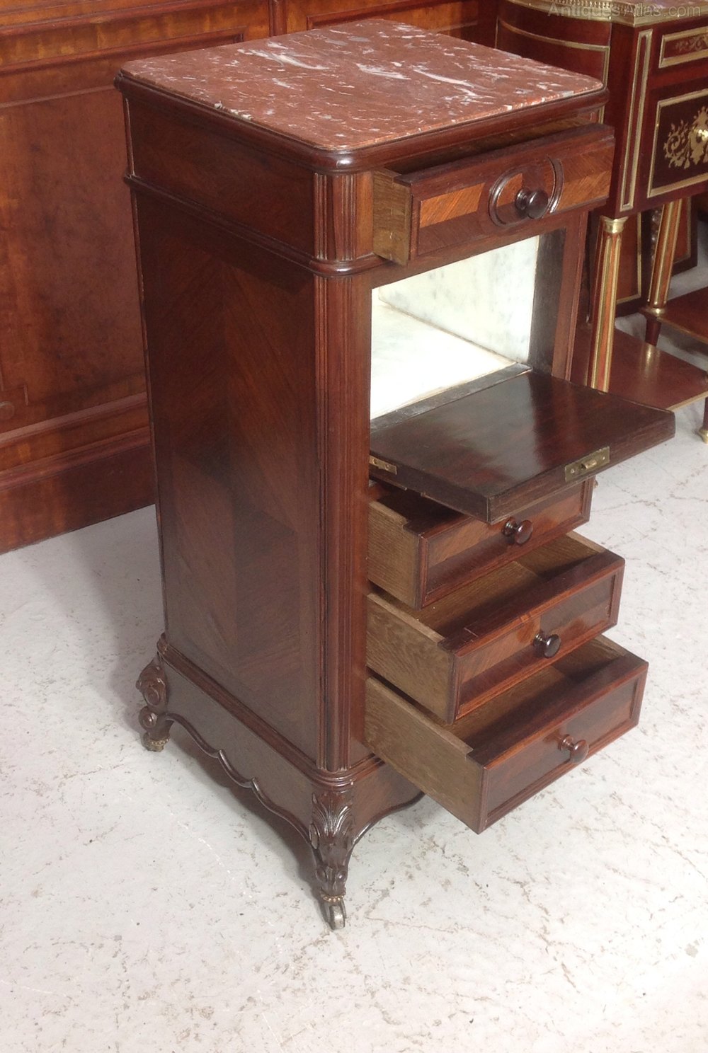 The cabinet has a marble top with a top drawer , a false drawer that drops down to reveal a marble lined cupboard.