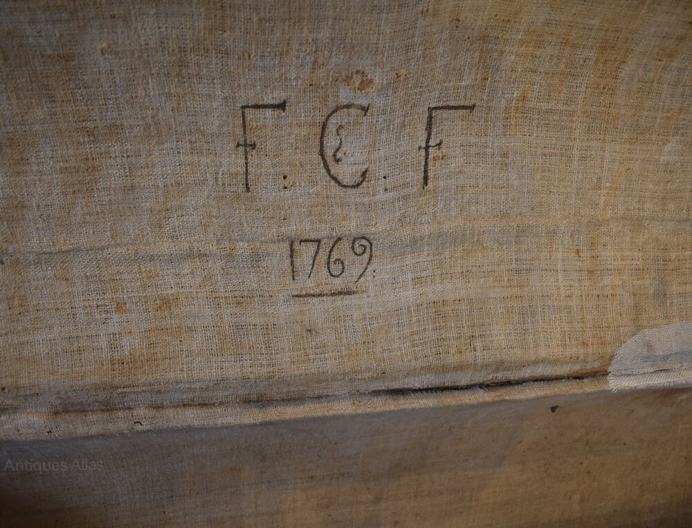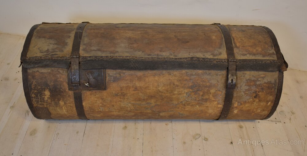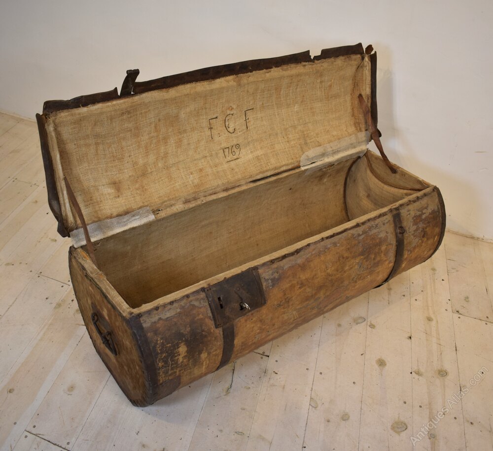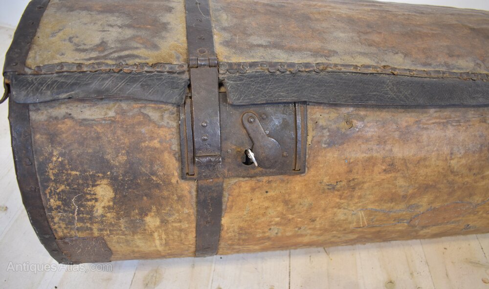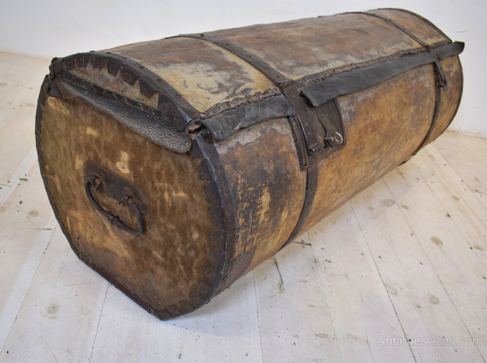 A most unusual round coffer, Swedish dated 1769. These are travelling trunks covered in hide, this one has metal straps and decorative metal on the ends. The iron handles have some decoration to. A rare survivor, we have never handled one before.