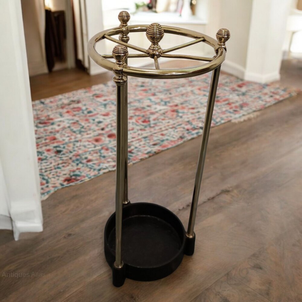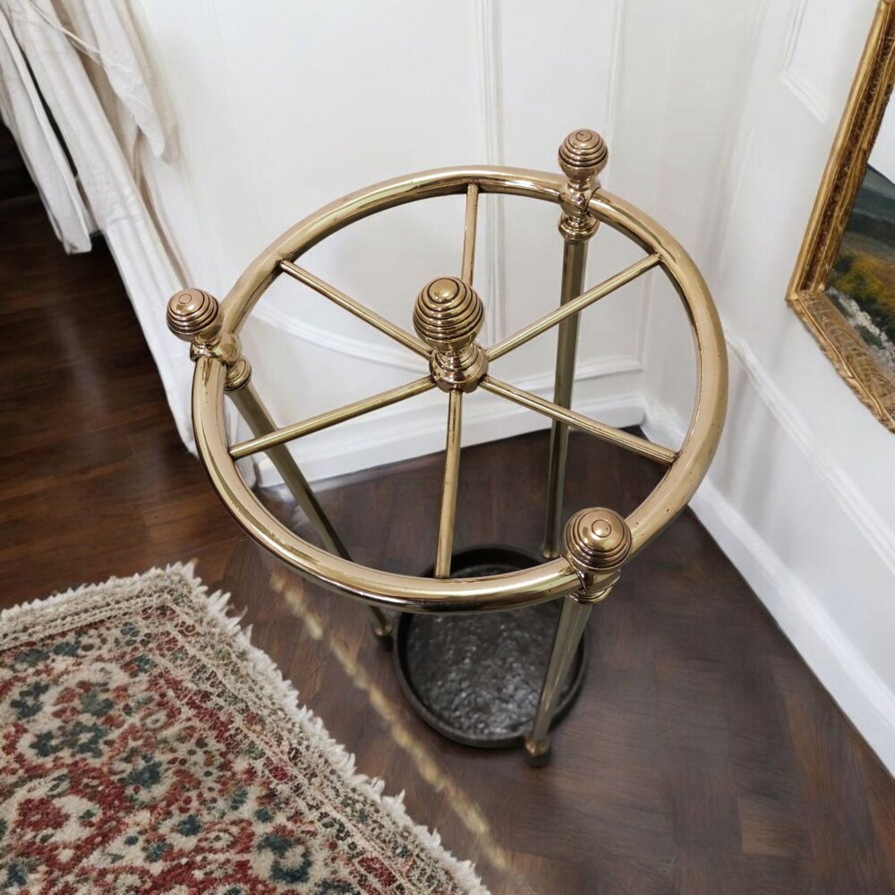 A rare example of an English Edwardian round polished brass and cast iron stick stand. Fully restored to a deep shine to the brass. Divided into six sections. Will easily take up to 40 sticks. Presented in immaculate condition. 24" tall x 10" diameter