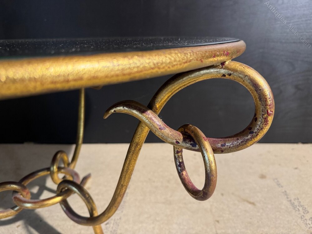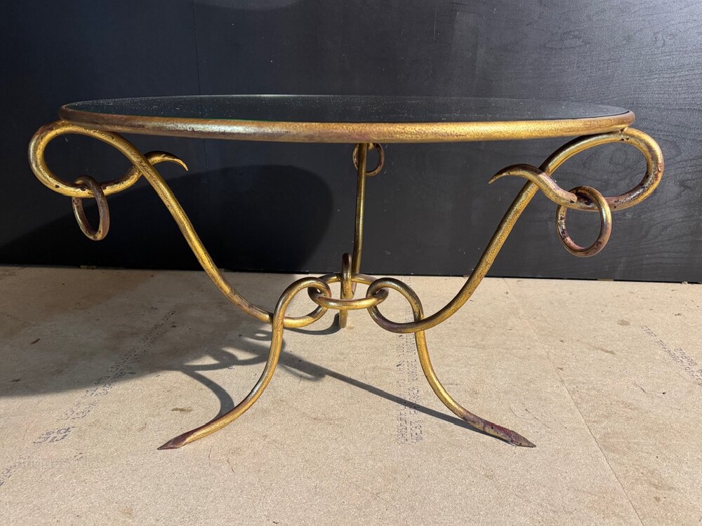 This round wrought gilded iron coffee table was designed by René Drouet (1899–1993) in the 1940s. The base is made of wrought iron with its original dark red and gilded gold patina. The round mirror top is in excellent condition.